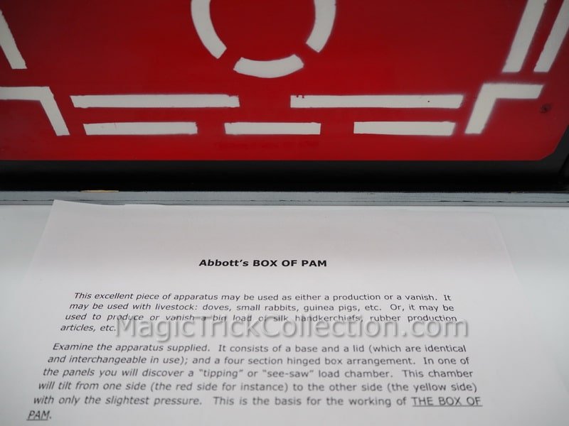 Abbott’s Magic Box of Pam when formed into a box like shape it is hinged to open all the way flat giving an unobstructed view of the interior yet upon reassembly, a large production is made from within.