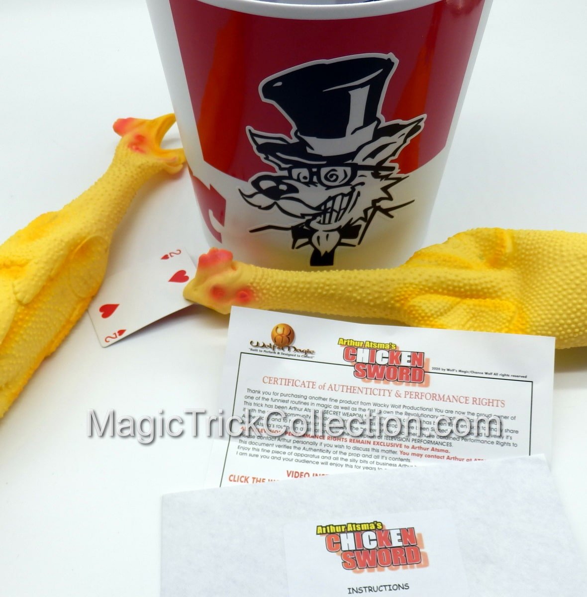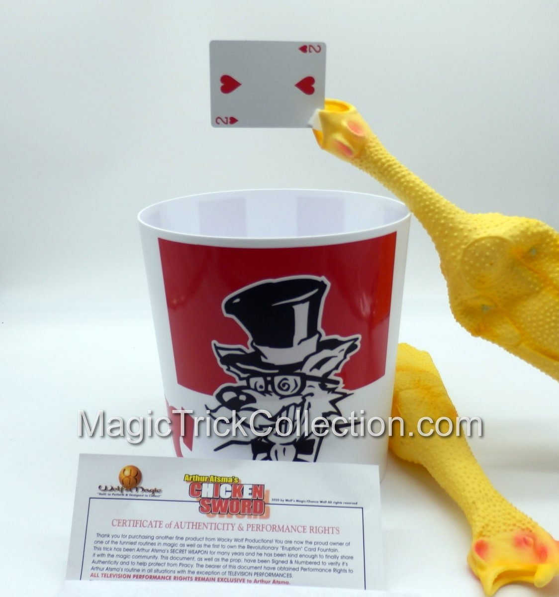 You receive: One Un-gimmicked Latex Rubber Chicken. One Gimmicked Latex Rubber Chicken Card Sword. The Revolutionary NEW CARD ERUPTION Fountain (C) 2003-2025 Wolf’s Magic and the Feather Launcher gimmick all built into a Custom unbreakable plastic Chicken Bucket with Custom Vinyl Graphics. Instructional link showing you Arthur’s INCREDIBLY FUNNY routine from START to FINISH as well as a step by step segment on set-up and performance tips. ( Requires one 9 volt battery not included )