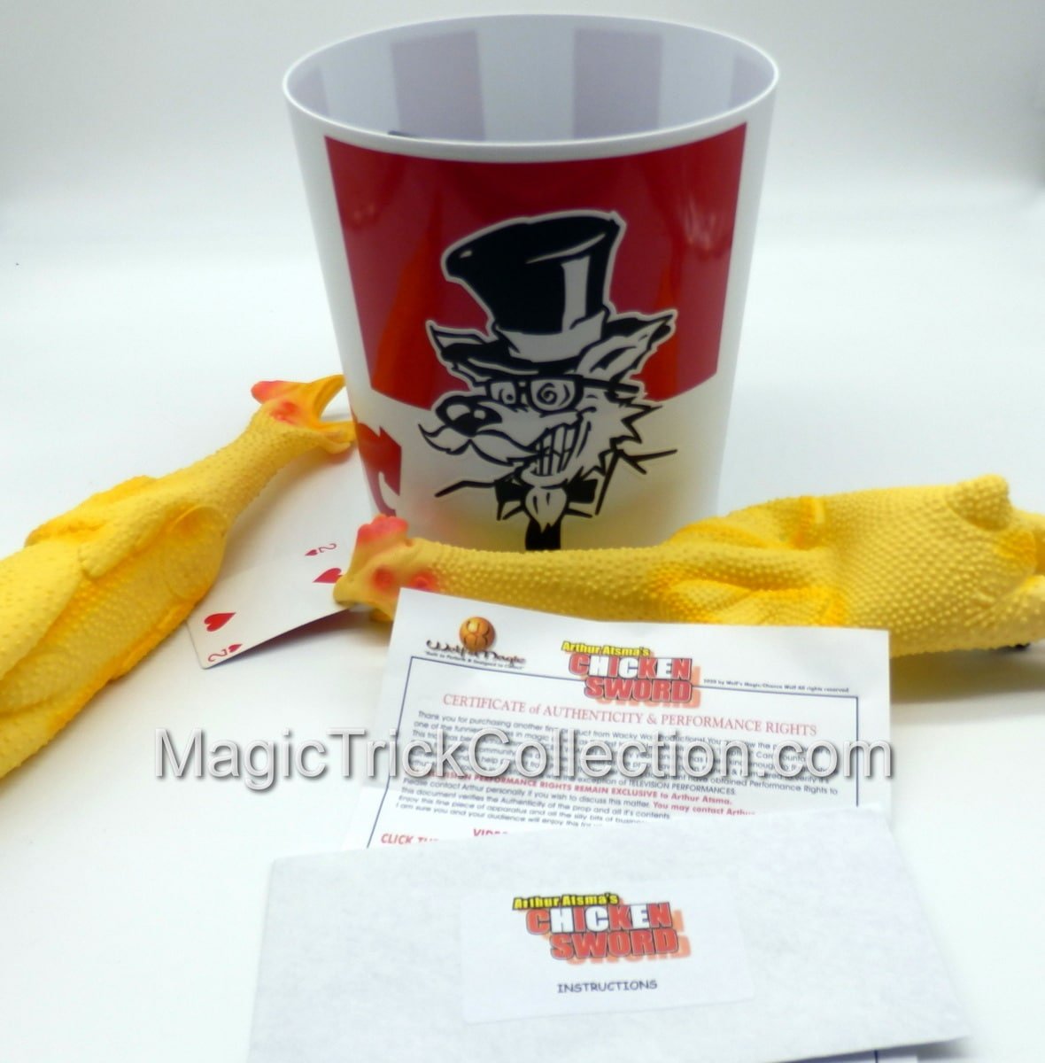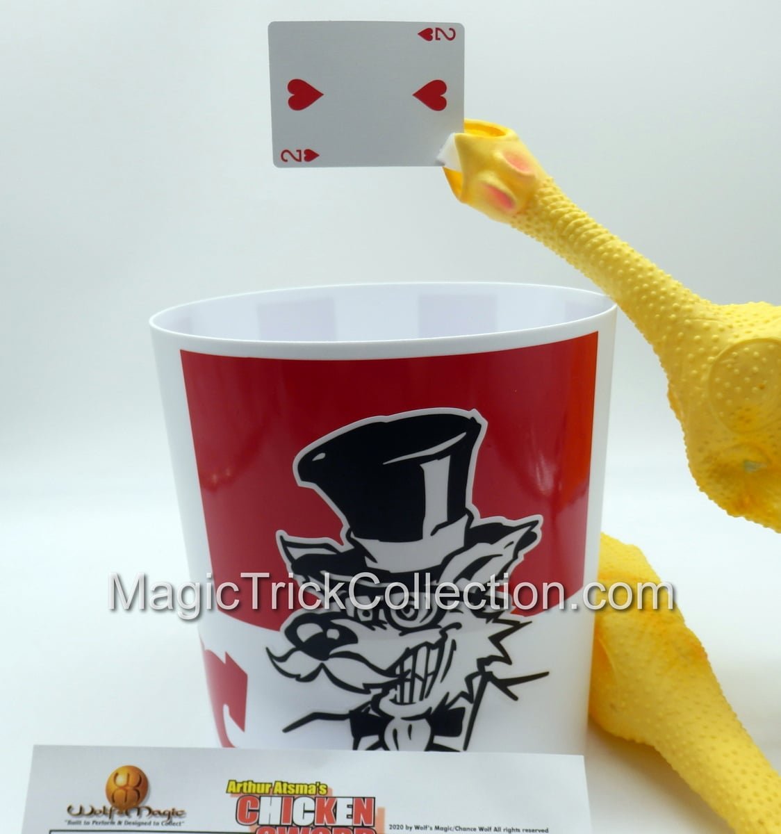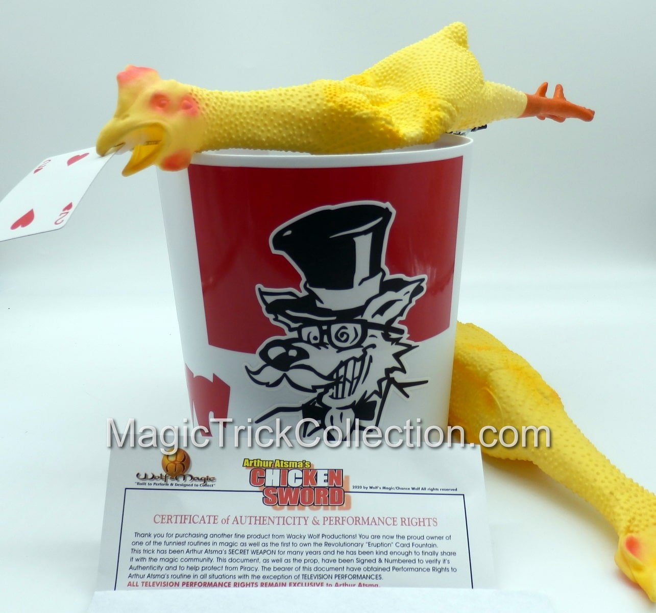 You receive: One Un-gimmicked Latex Rubber Chicken. One Gimmicked Latex Rubber Chicken Card Sword. The Revolutionary NEW CARD ERUPTION Fountain (C) 2003-2025 Wolf’s Magic and the Feather Launcher gimmick all built into a Custom unbreakable plastic Chicken Bucket with Custom Vinyl Graphics. Instructional link showing you Arthur’s INCREDIBLY FUNNY routine from START to FINISH as well as a step by step segment on set-up and performance tips. ( Requires one 9 volt battery not included )