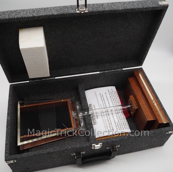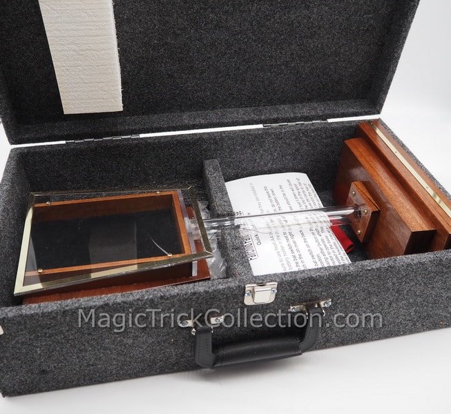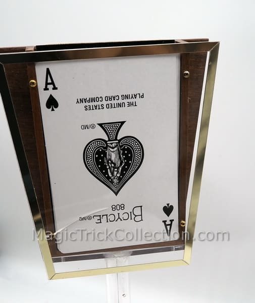 Three jumbo cards are chosen, and 2 are returned to the deck. The third card is placed into an envelope then returned to the deck. The entire deck is placed into a houlette on top of a clear column pedestal, 18″ tall. Then the magic begins as one of the chosen cards rises up from the deck. This is followed by the second chosen card. then the third chosen card rises from the deck from within the envelope