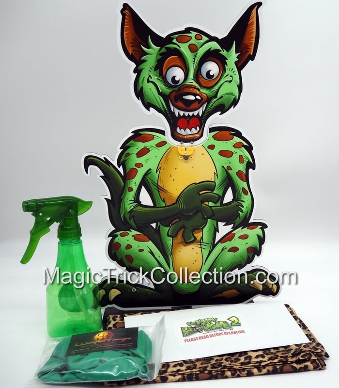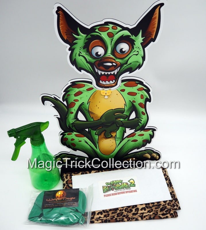 This is a BASIC synopsis of a well developed routine which will be sure to entertain! The routine is based on a competition between 3 kids to tell their best joke! All three kids are brought on stage and a series of great bits take place as the kids tell their jokes the Happy Hyena ACTUALLY LAUGHS as his HEAD SHAKES BACK and FORTH! The laughter continues leading up to the Happy Hyena HEAD SPINS DOWN AND SWINGS ABOUT laughing his head off! The magician explains that the Hyena’s who have spots actually communicate through laughter and this particular guy has too many spots as he can’t seem to stop laughing. A Cloth Bag (Devil’s Hank now INCLUDED) is brought out along with a Bottle of” SPOT REMOVER”. The Hyena’s Head is placed in the bag and the “Spot Remover” is squirted into the bag, the bag is rubbed a bit, more spot remover, more rubbing then…OOPS!! The bag is opened and the HEAD HAS VANISHED!! Sorry kids, we seemed to have used too much Spot Remover!! The kids are now asked to use TEAM WORK to magically return the Hyena’s Head! Working together, the kids blow up a balloon, draw a face on it and place it on the Hyena’s body. All together, the kids scream the magic words and…POP!…the BALLOON EXPLODES as the HYENA’S HEAD MAGICALLY REAPPEARS!!
