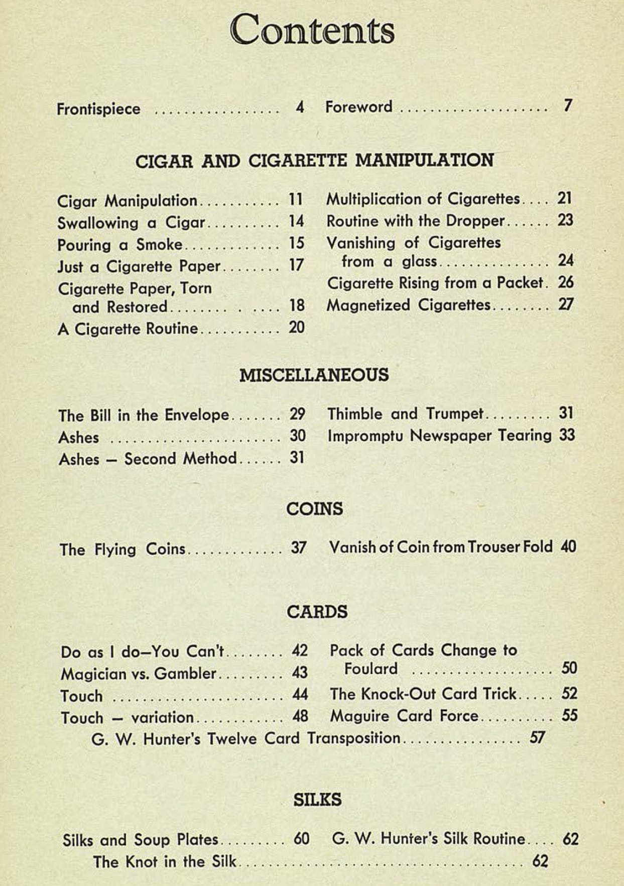 - Card and close-up magic: The book covers a range of effects, including card transpositions, cigar and cigarette manipulation, and coin effects.