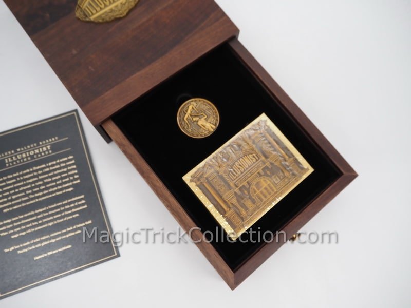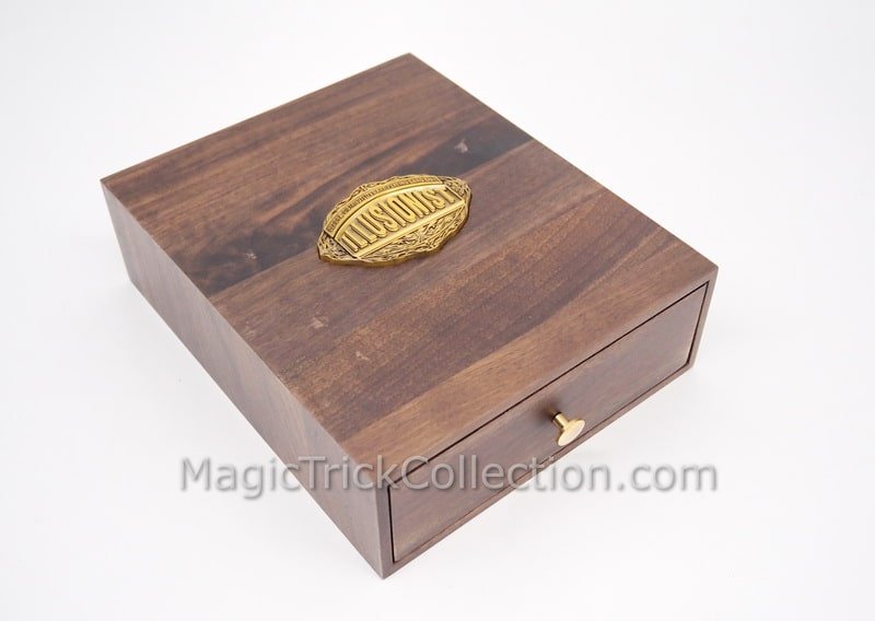 The solid walnut display box is inlaid with a golden metal nameplate. The display box creatively functions as a working Drawer Box magic effect. You are in full control of whether the box is shown to be full or empty.