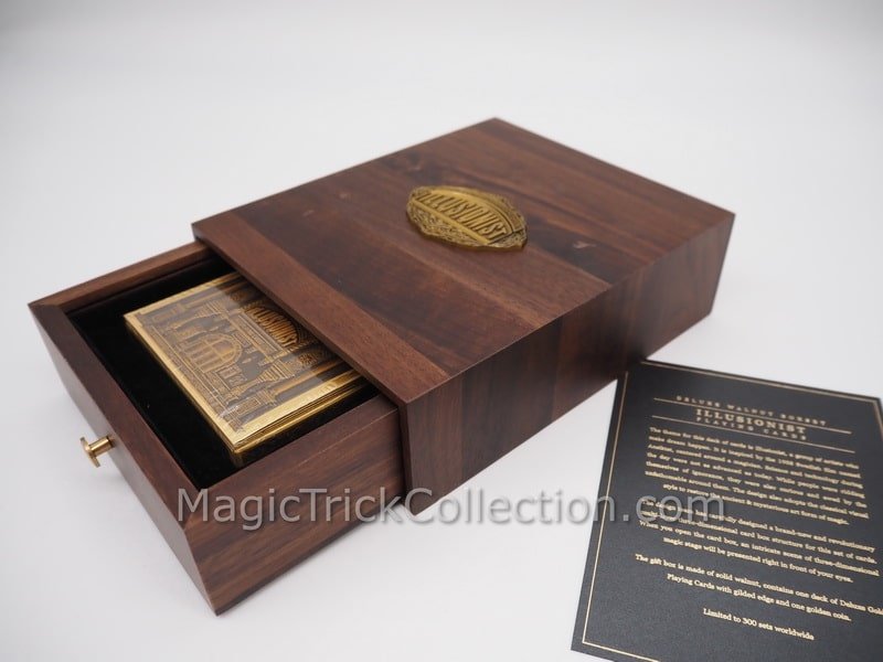 The Deluxe Walnut Boxset is the rarest and most luxurious version of the After Sound series. You receive one (1) deck of luxury gold-gilded playing cards and a Golden Chinese Coin with Mystic Knot Charm Tassel.