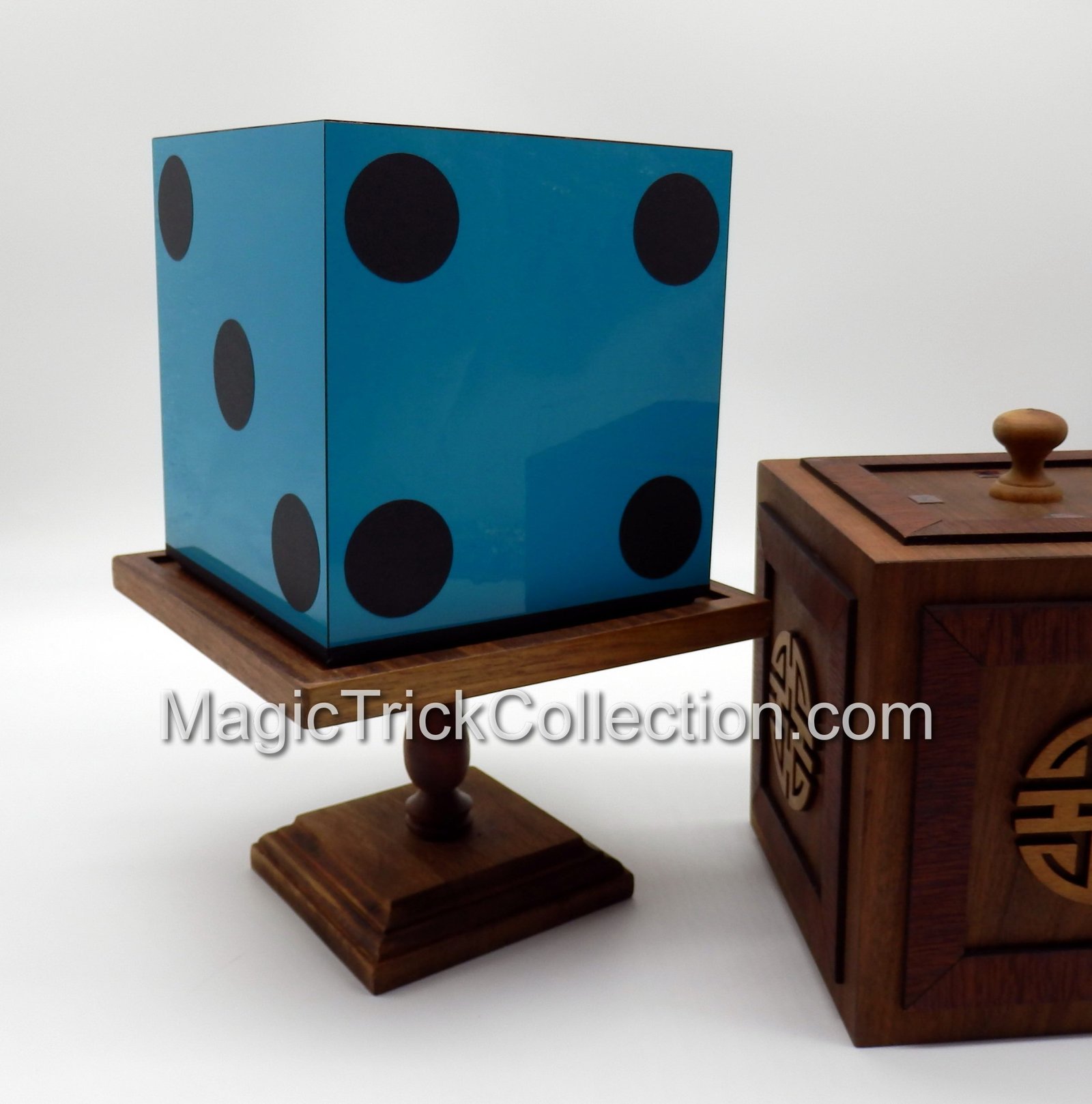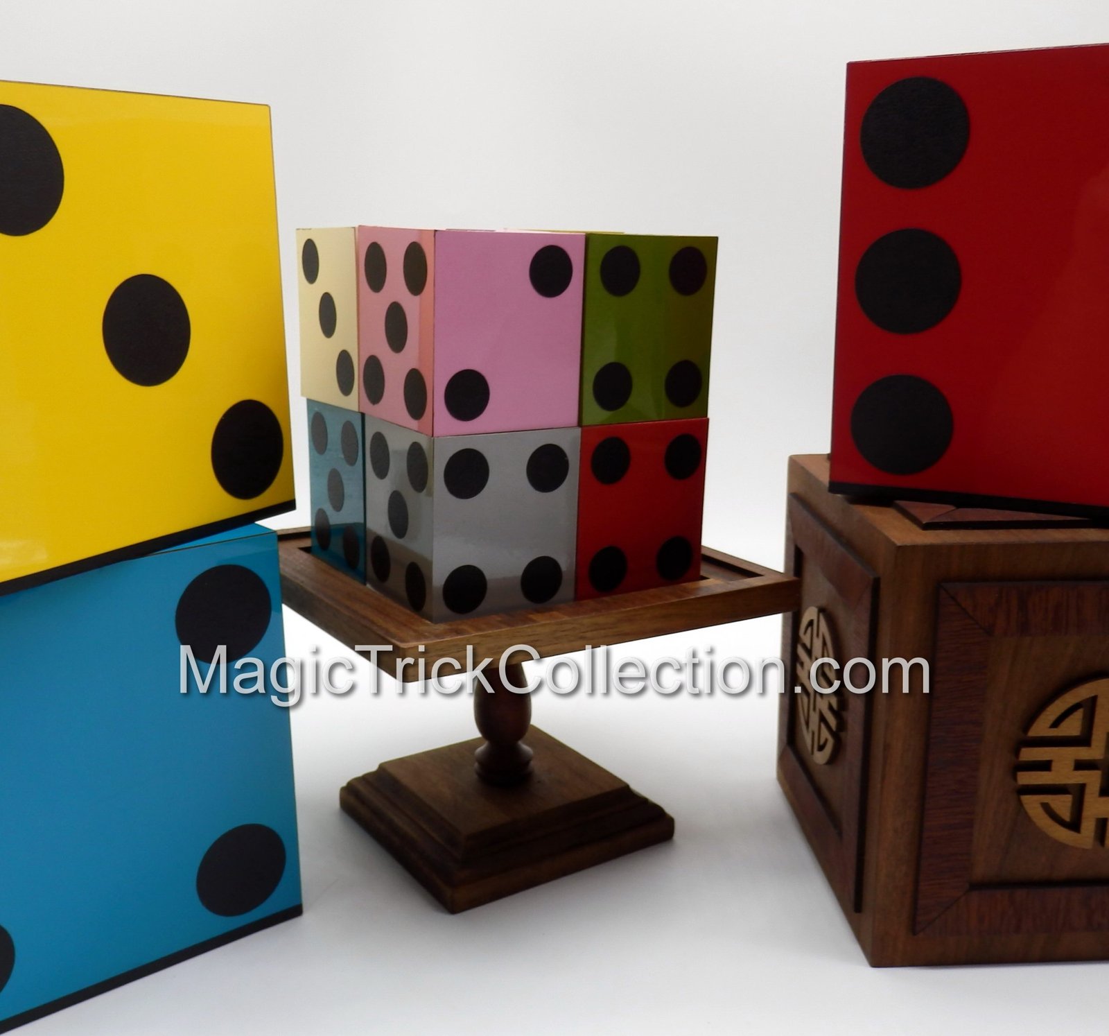 Show a giant die resting on a pedestal. Place a cover over the die, remove the cover, and the die has changed color! Show the inside of the cover to be empty. Repeat this several times, each time magically changing the die to another color! When the cover is placed and removed the final time, it is found that the large die has turned into 8 smaller dice, which you can stack into piles.