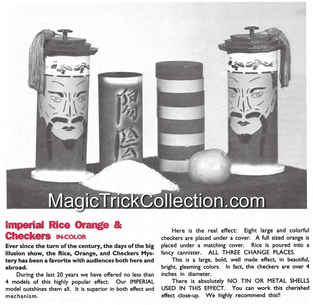 MAK Magic Imperial Rice, Orange & Checkers is a classic three-way transposition effect featuring large, brightly decorated props for stage magic.