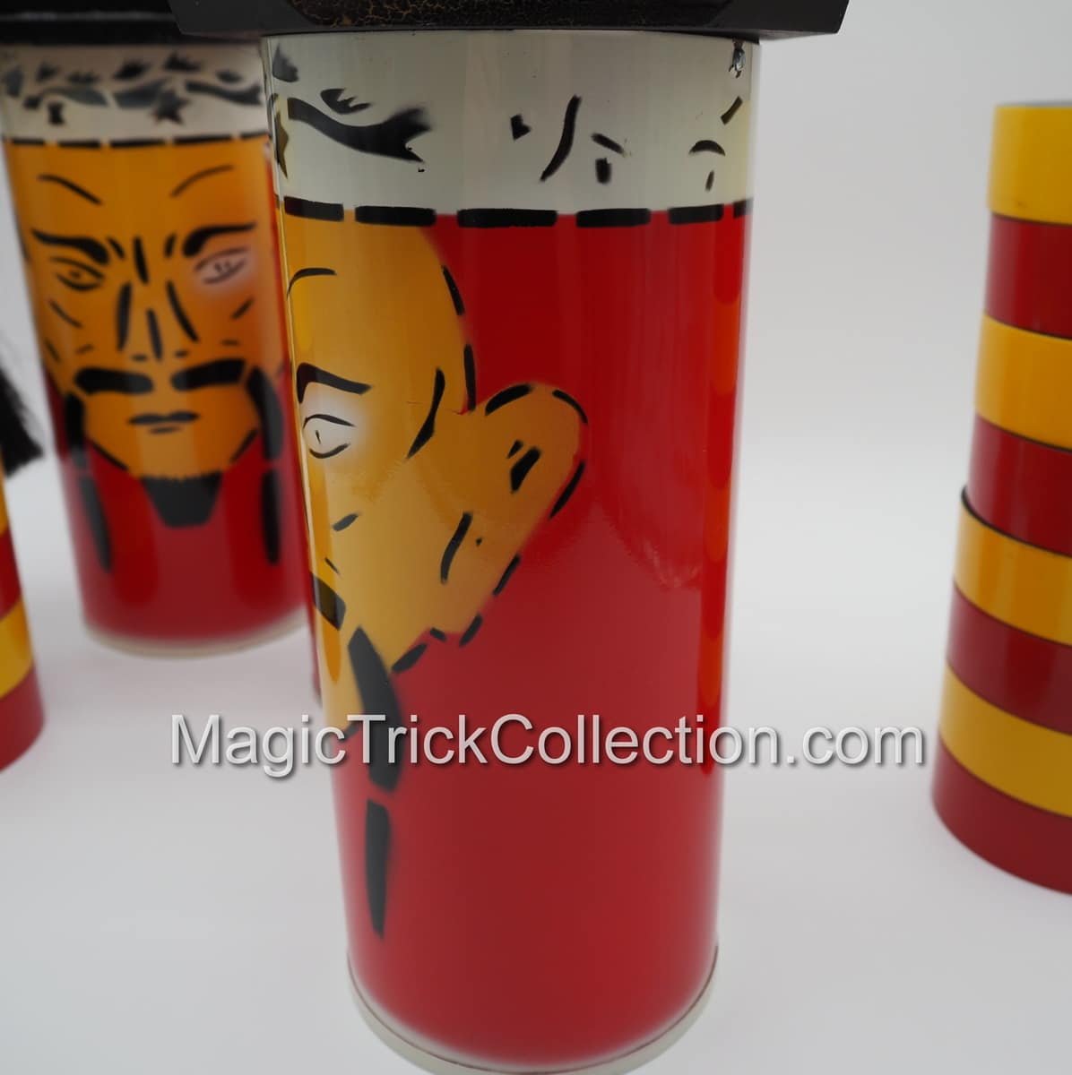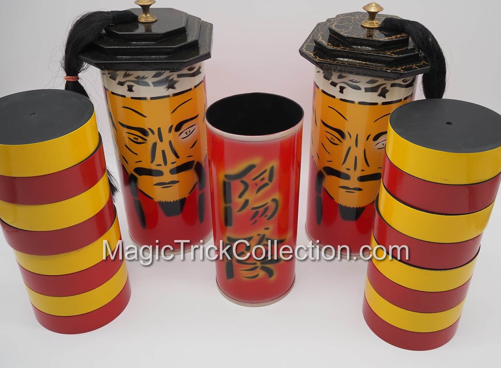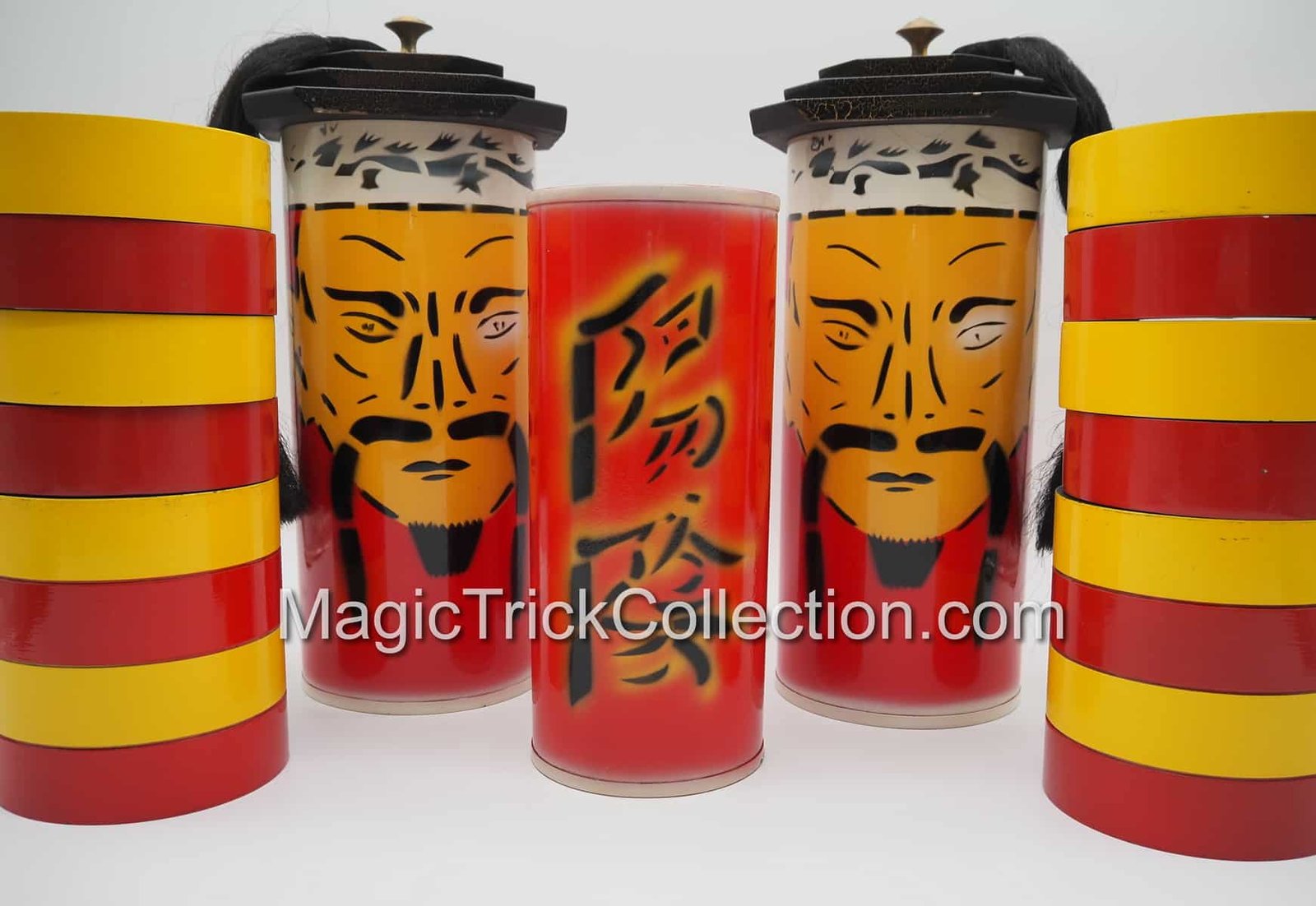 This is the MAK Magic version of the classic Orange, Rice & Checkers where all three items magically change places with each other within the two large Oriental decorated cylinders.