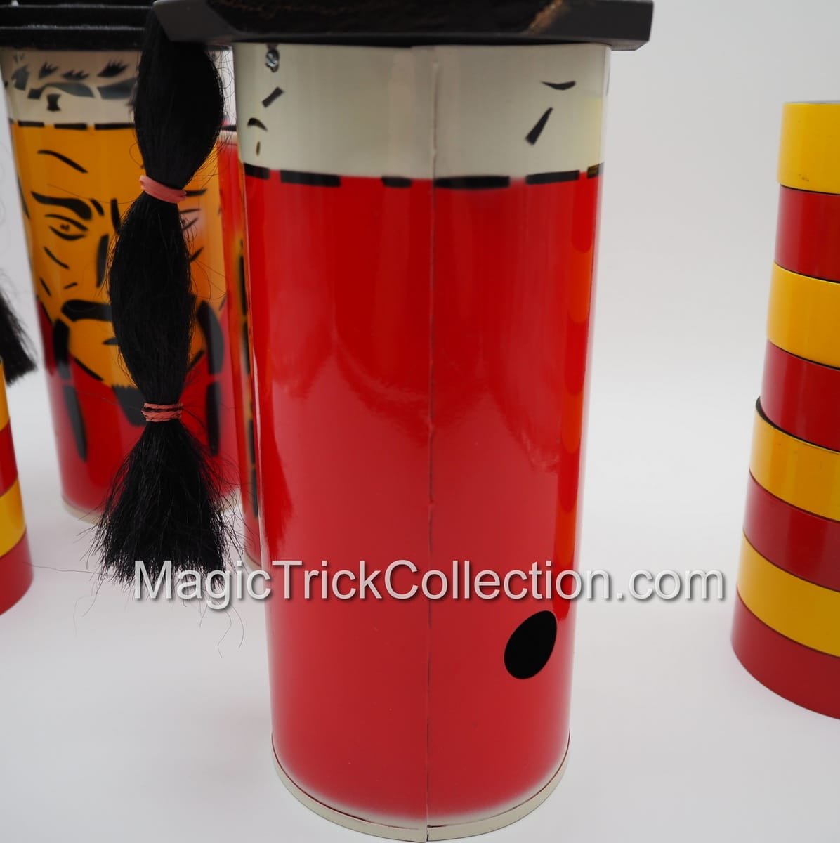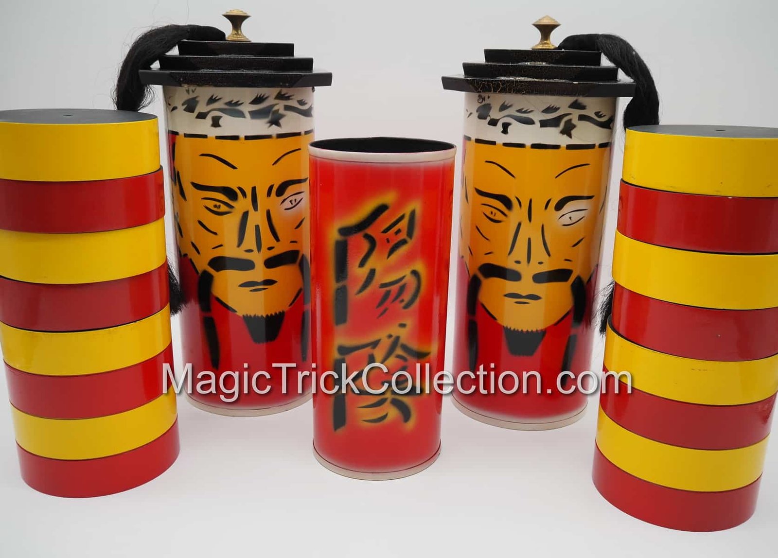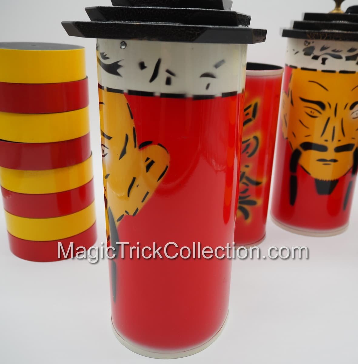 This is the MAK Magic version of the classic Orange, Rice & Checkers where all three items magically change places with each other within the two large Oriental decorated cylinders.