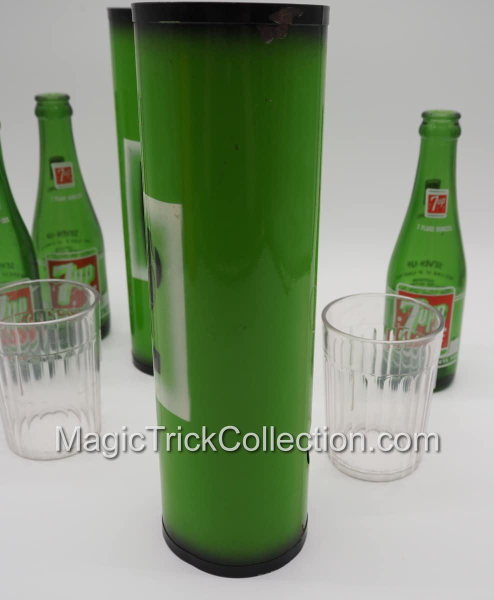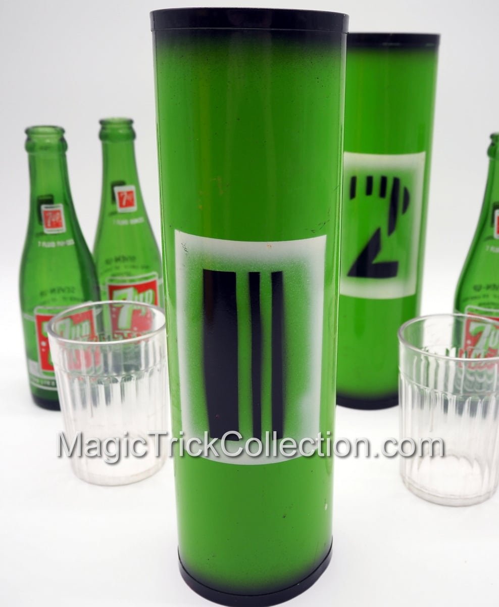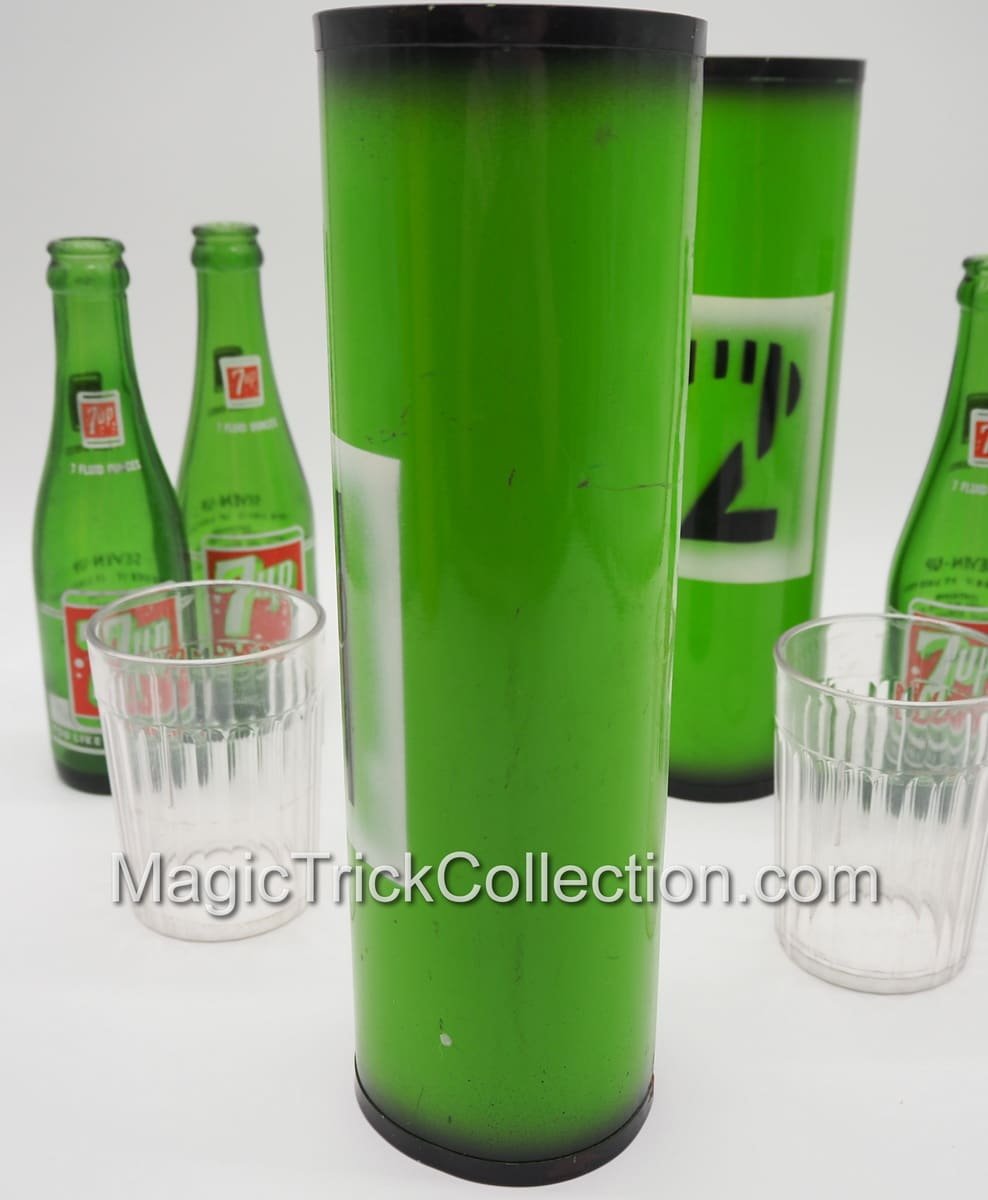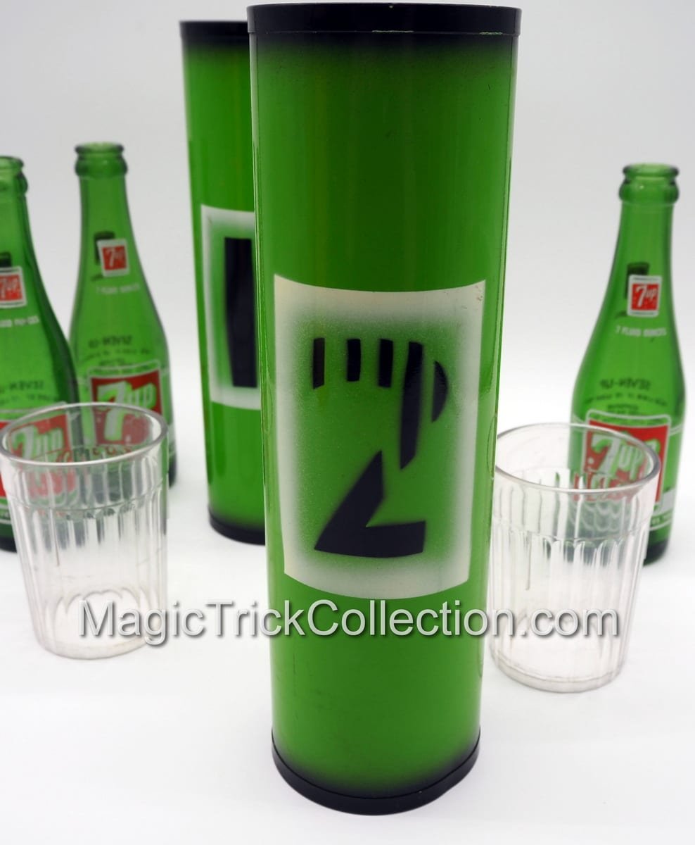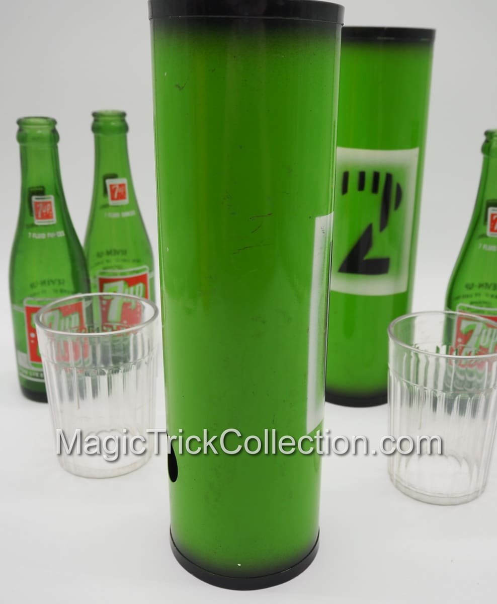 Just received two of these from an estate, both with 7-UP bottles which look the appropriate size, however do not fit the narrow end which hold the two plastic tumblers. This first MAK Magic Passe 7-UP Bottles listing (second to be posted at a later date) has three (7oz) 7-UP bottles, so one extra or one to sell.