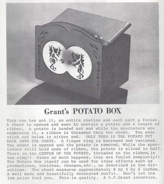 - Effect: The magician borrows a ring from an audience member, makes it vanish, and then reveals it has appeared inside a potato that was securely sealed within the wooden “Potato Box”.