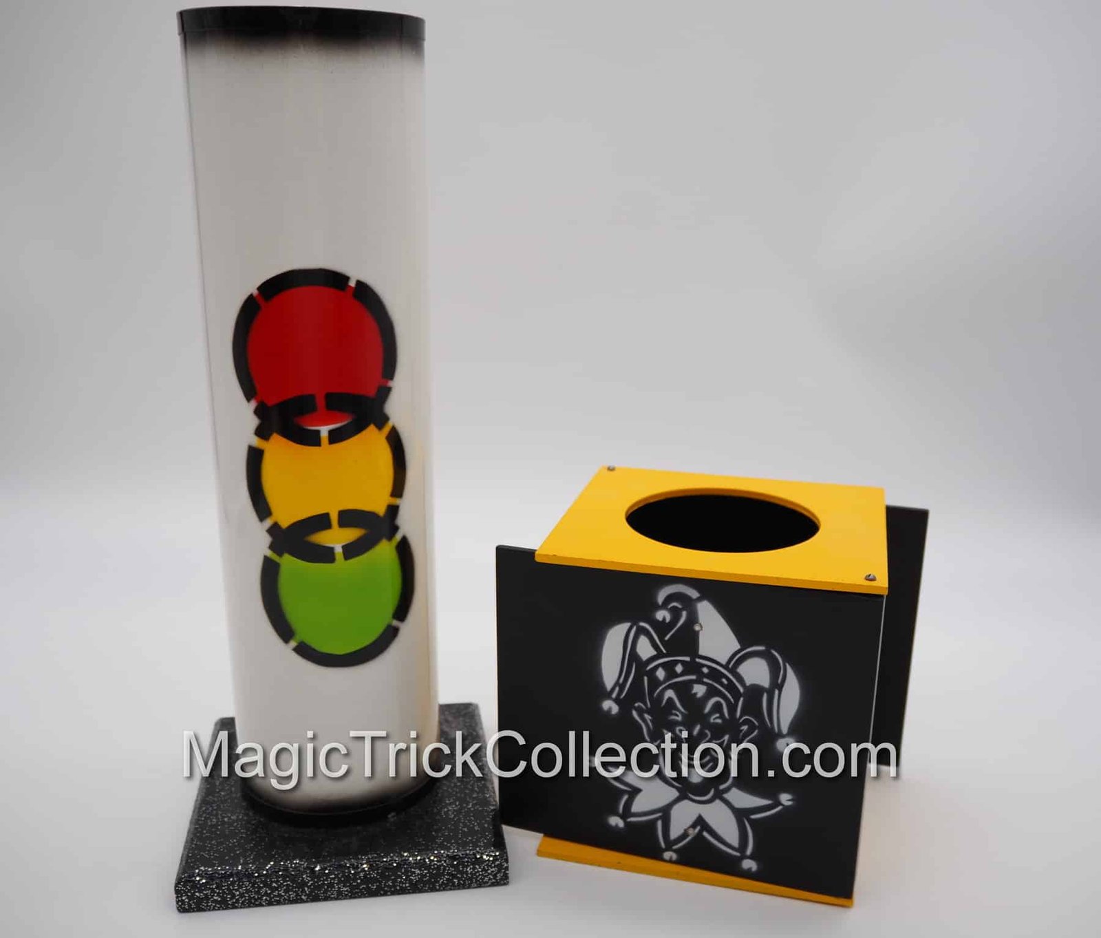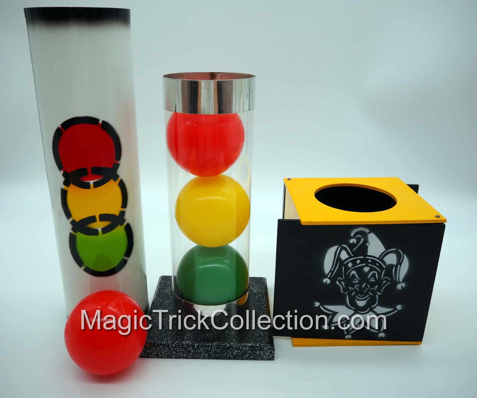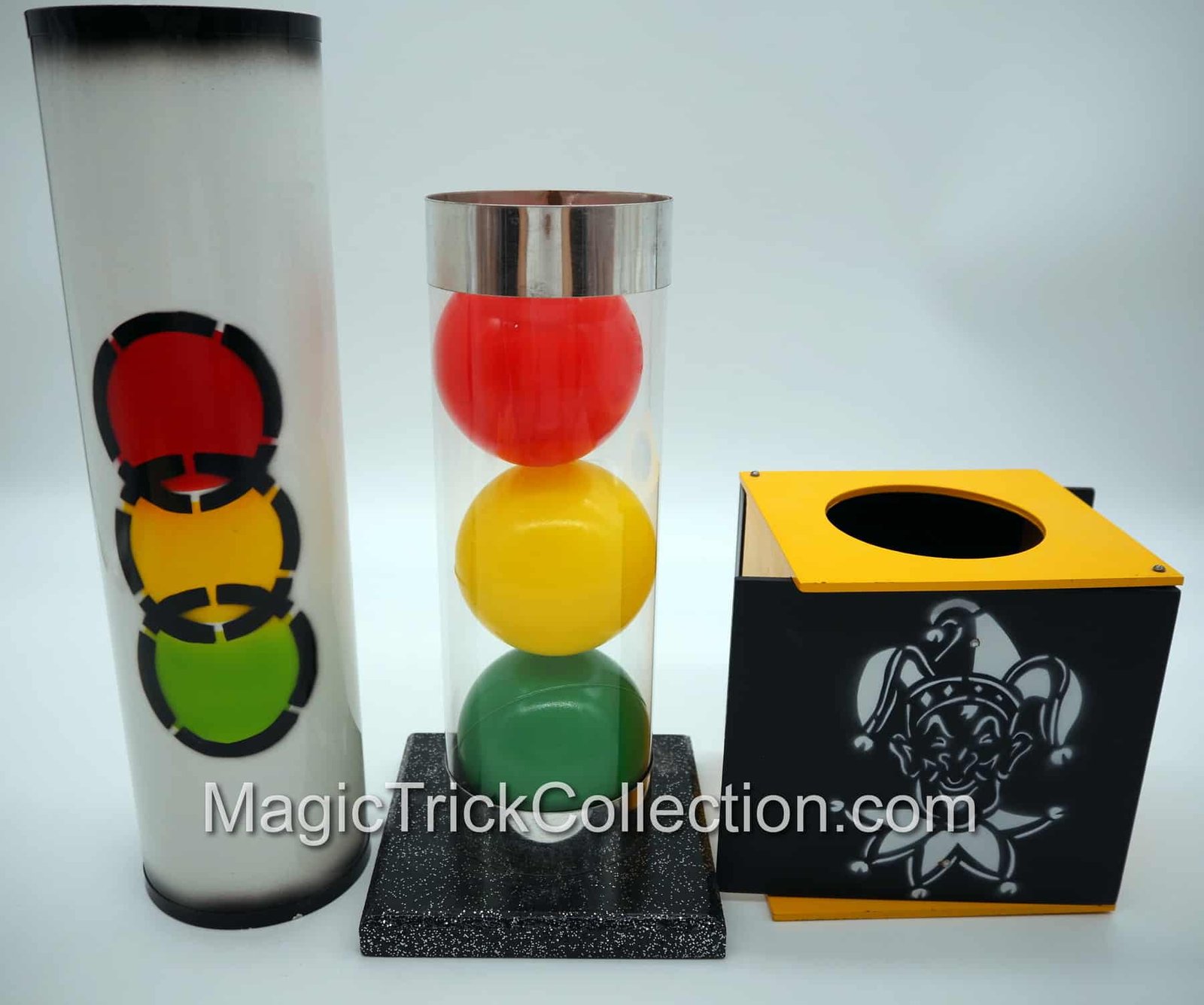 The MAK Magic Strat-o-Spheres prop consists of a tall clear plastic tube with metallic ends, which rests in a wooden base, a highly decorated Metal Tube and a Wooden Box, and three differently colored balls, each one 3 inches in diameter consisting of a red, yellow, and green ball that all match the metal Tube color design!