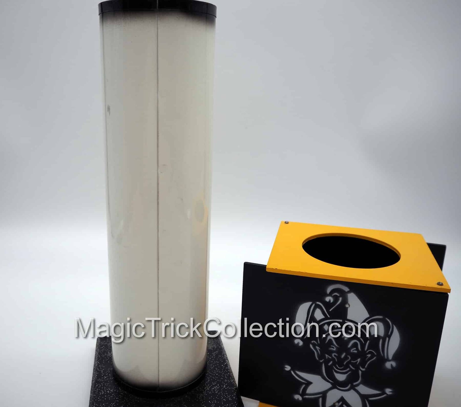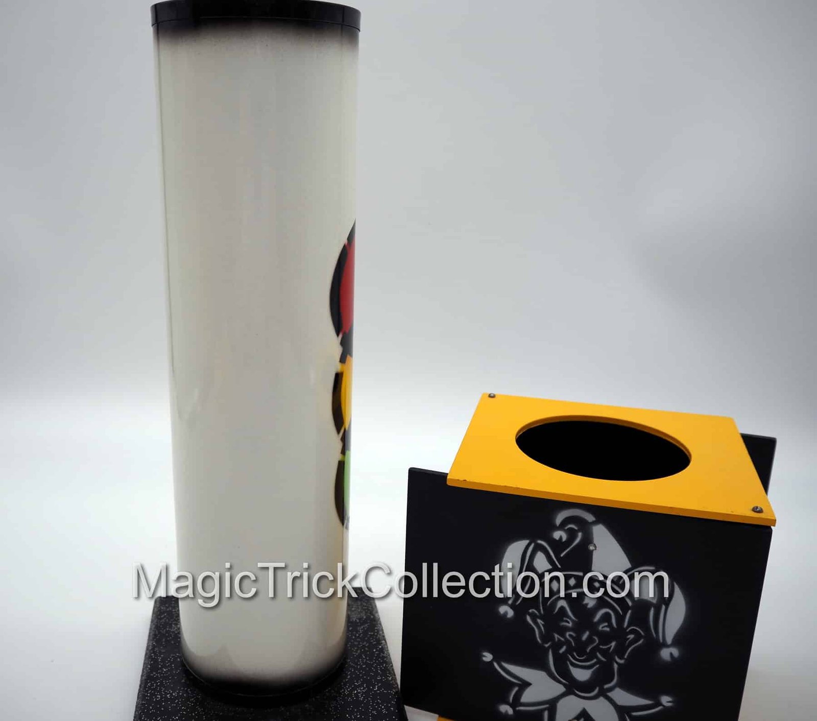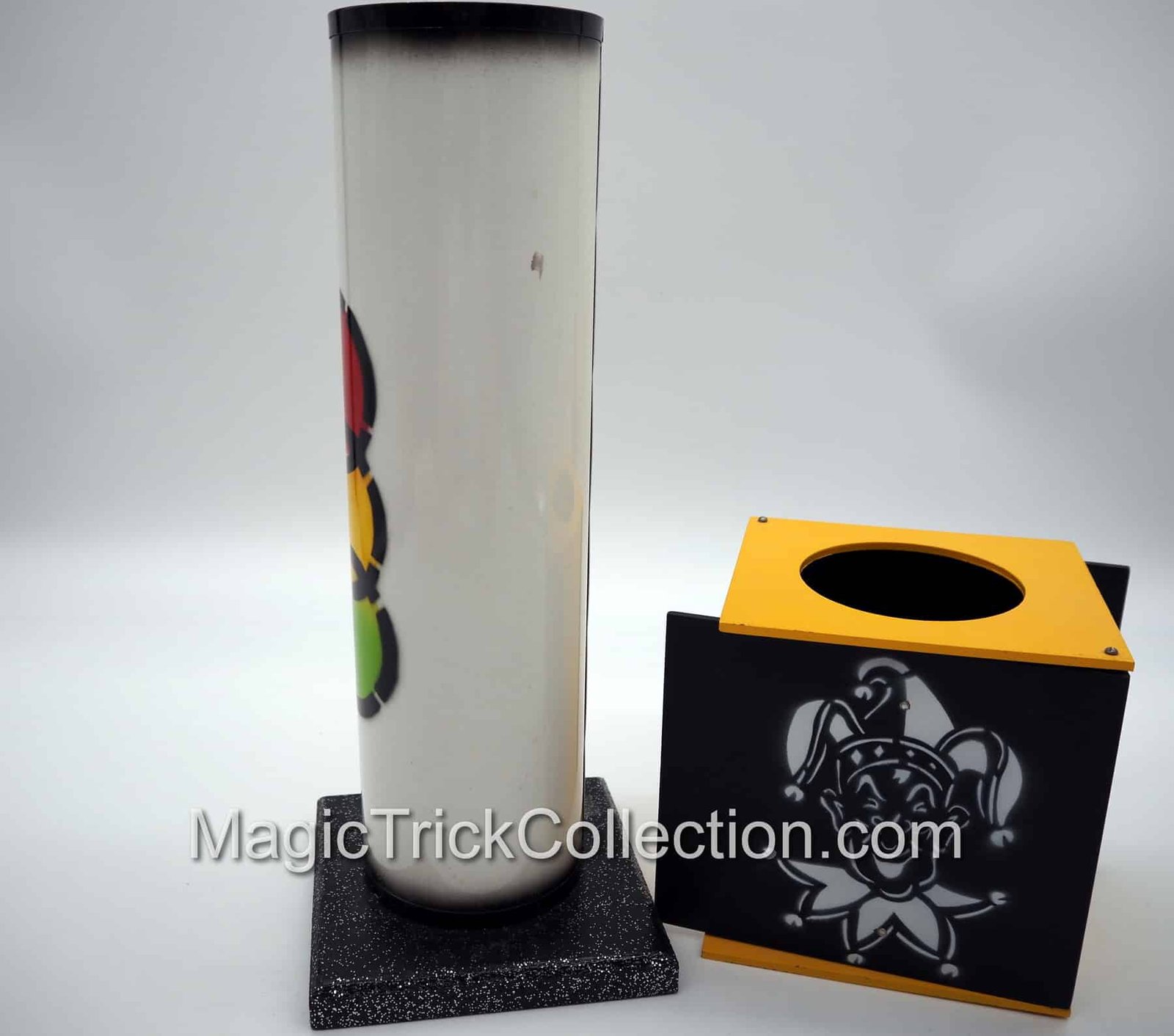 The MAK Magic Strat-o-Spheres prop consists of a tall clear plastic tube with metallic ends, which rests in a wooden base, a highly decorated Metal Tube and a Wooden Box, and three differently colored balls, each one 3 inches in diameter consisting of a red, yellow, and green ball that all match the metal Tube color design!
