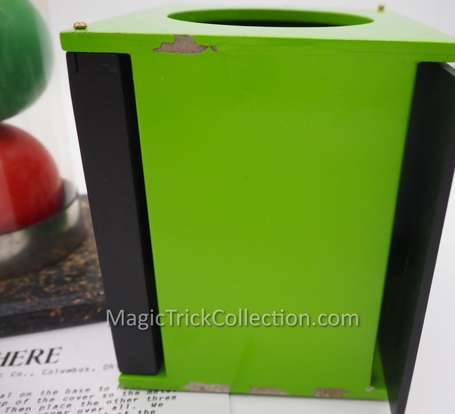 Finally, the magician takes the red ball and places it in the wooden box. Magician grasps the box by the ends of the doors and flips it open, the ball has vanished! The audience sees completely through the box. The red ball then reappears in the plastic tube between the other two.