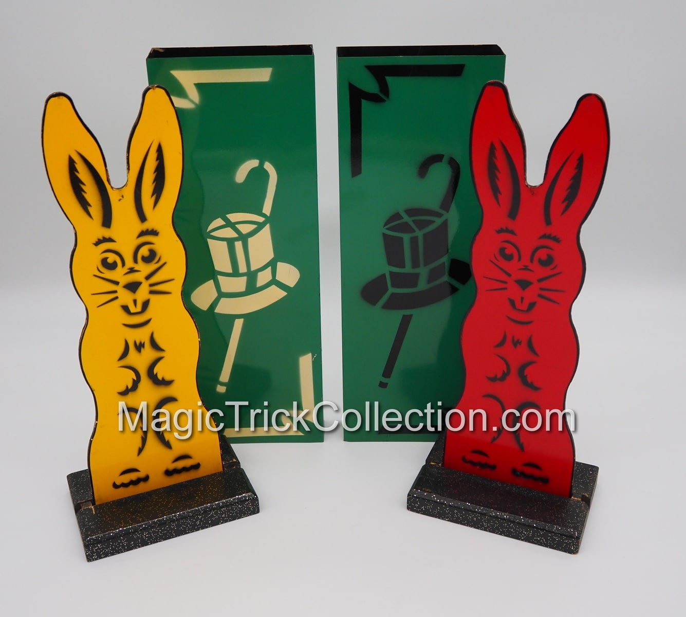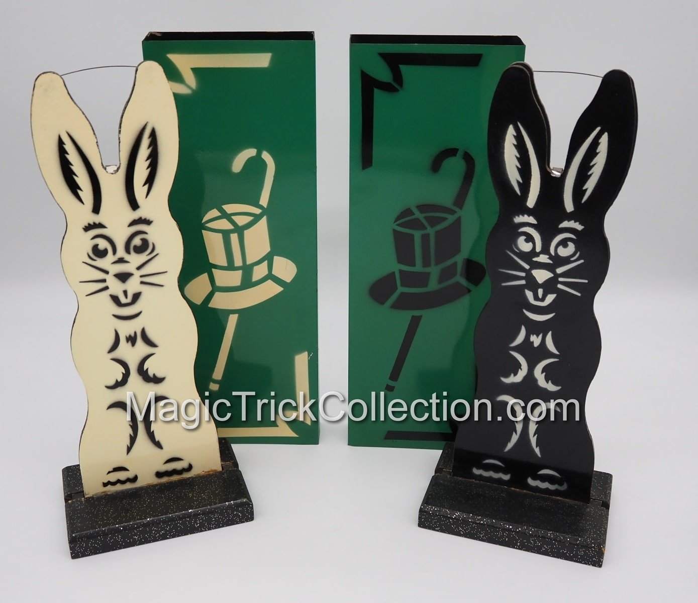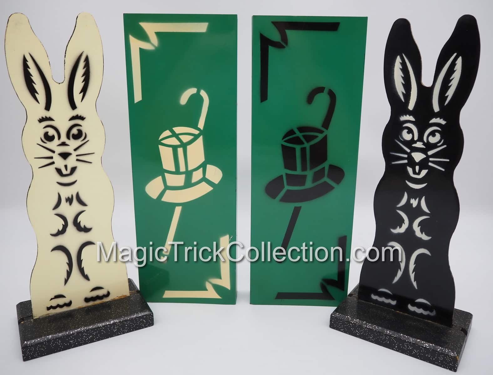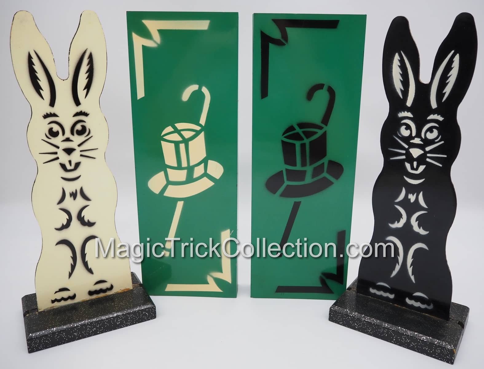 - Effect: The magician displays two large cut-out rabbits, one white and one black, along with two covers (tubes), each decorated with a matching top hat. The rabbits appear to magically switch places multiple times. The audience, believing they have figured out the trick (that the rabbits are merely turned around), is then surprised when the magician reveals the reverse sides are two entirely different colors, typically red and green or red and blue.