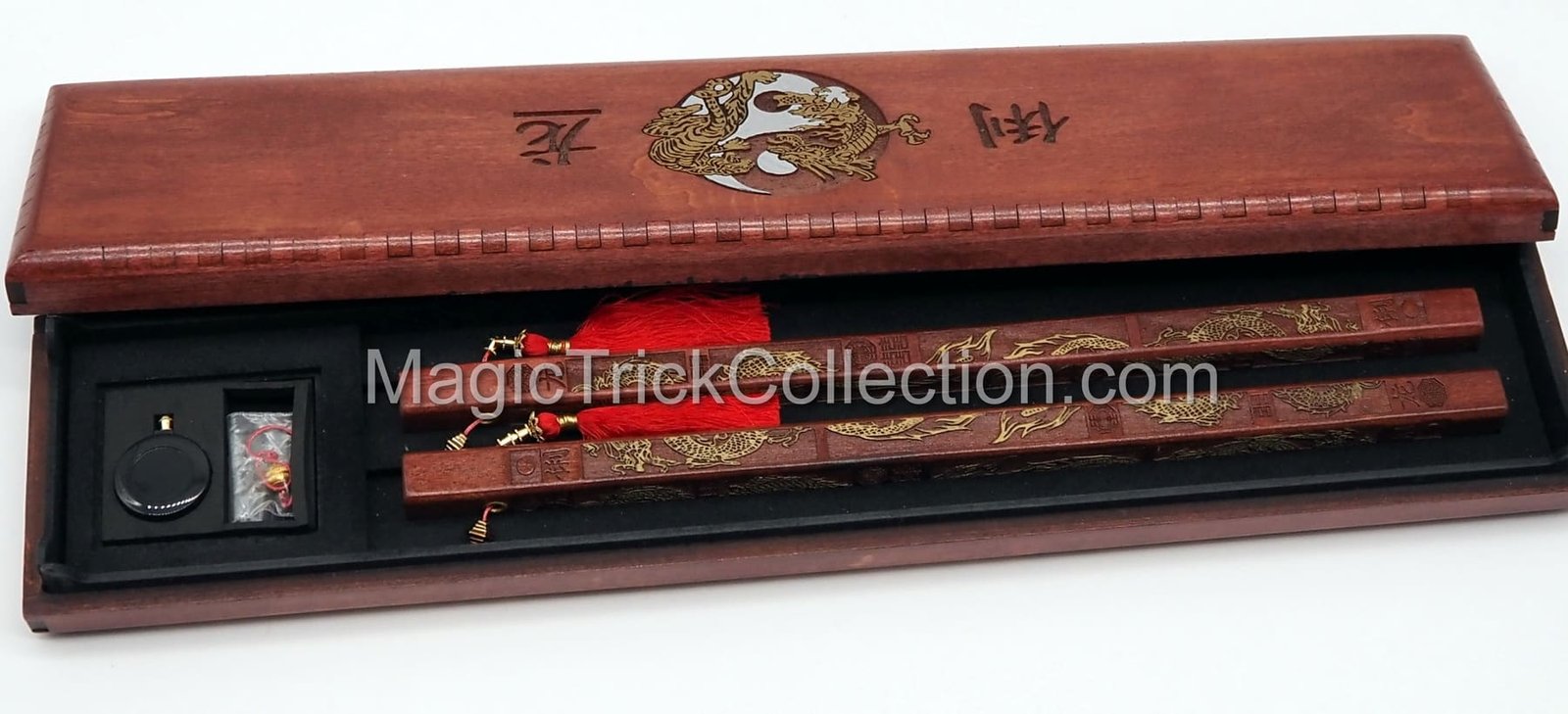 Master Dragon Sticks Deluxe (Chinese Sticks) by Handcrafted Miracles are precision carved from select hardwood and hand leafed in 14 kt. gold these Chinese Sticks are perhaps the finest ever produced. But don’t let the gallery quality appearance fool you they have been completely re-engineered from a magic perspective to provide the smoothest, fastest response possible. The Master Dragon Sticks Deluxe are powered by an internal sled riding on sealed stainless steel ball bearings and incorporate a revolutionary new braking system which allows the entire effect to be performed without the telltale tipping of the sticks that other Chinese Sticks versions require. The tassels remain in the performer’s control at all times.