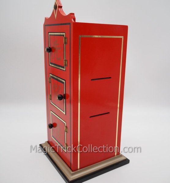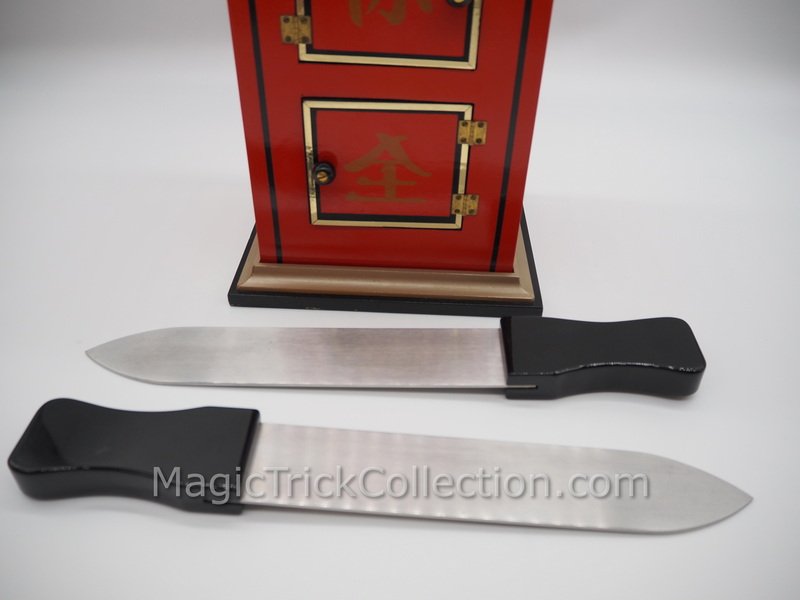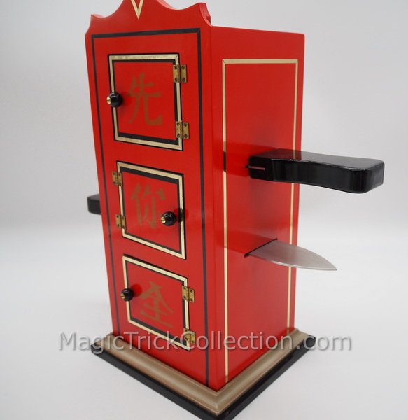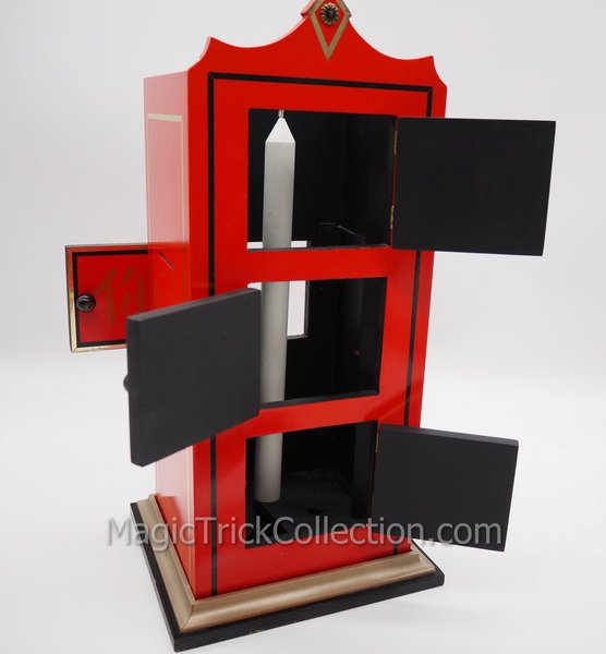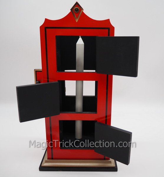 The effect consists of the middle section of a solid candle being vanished as two blades penetrate the candle and cabinet.