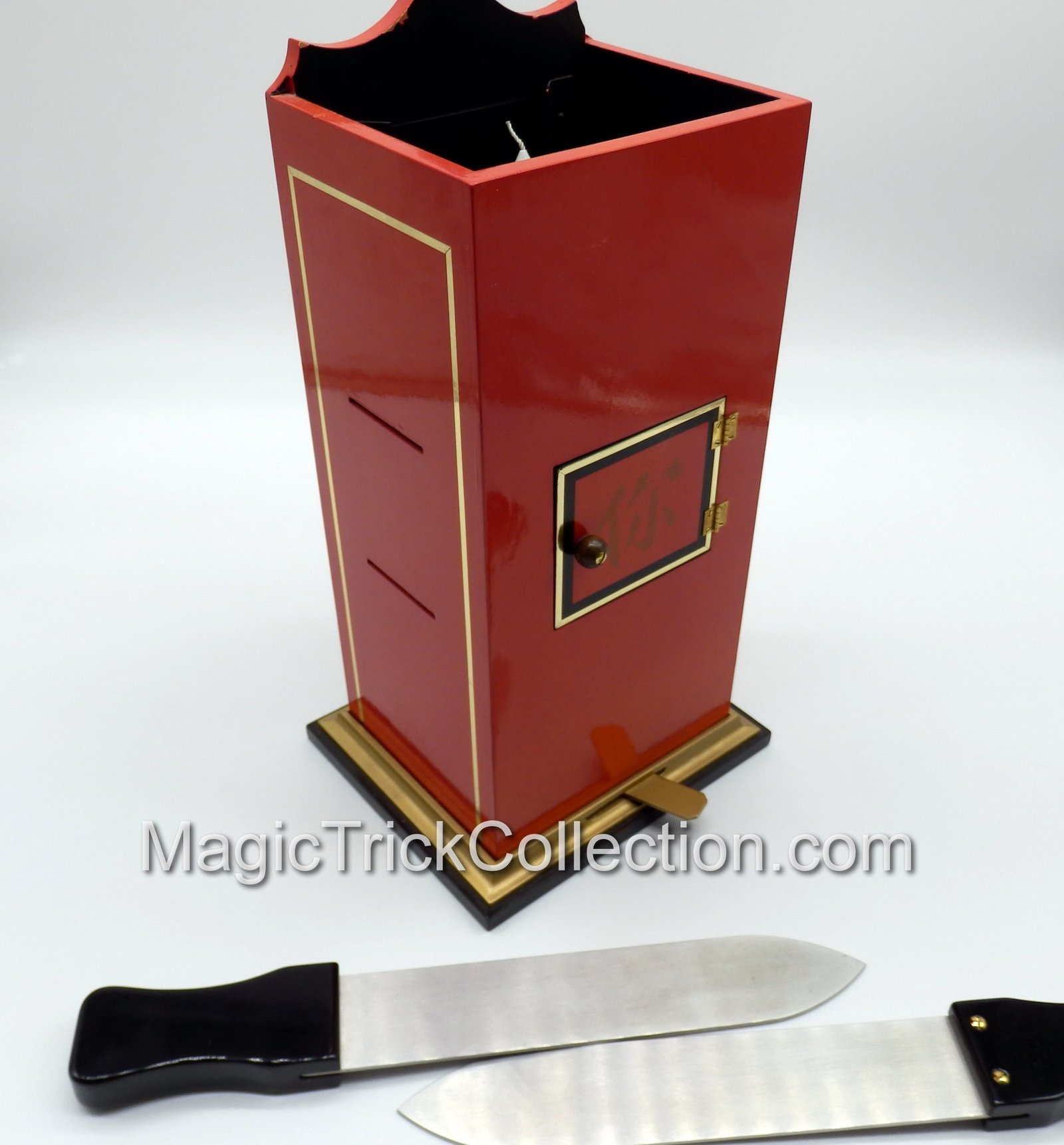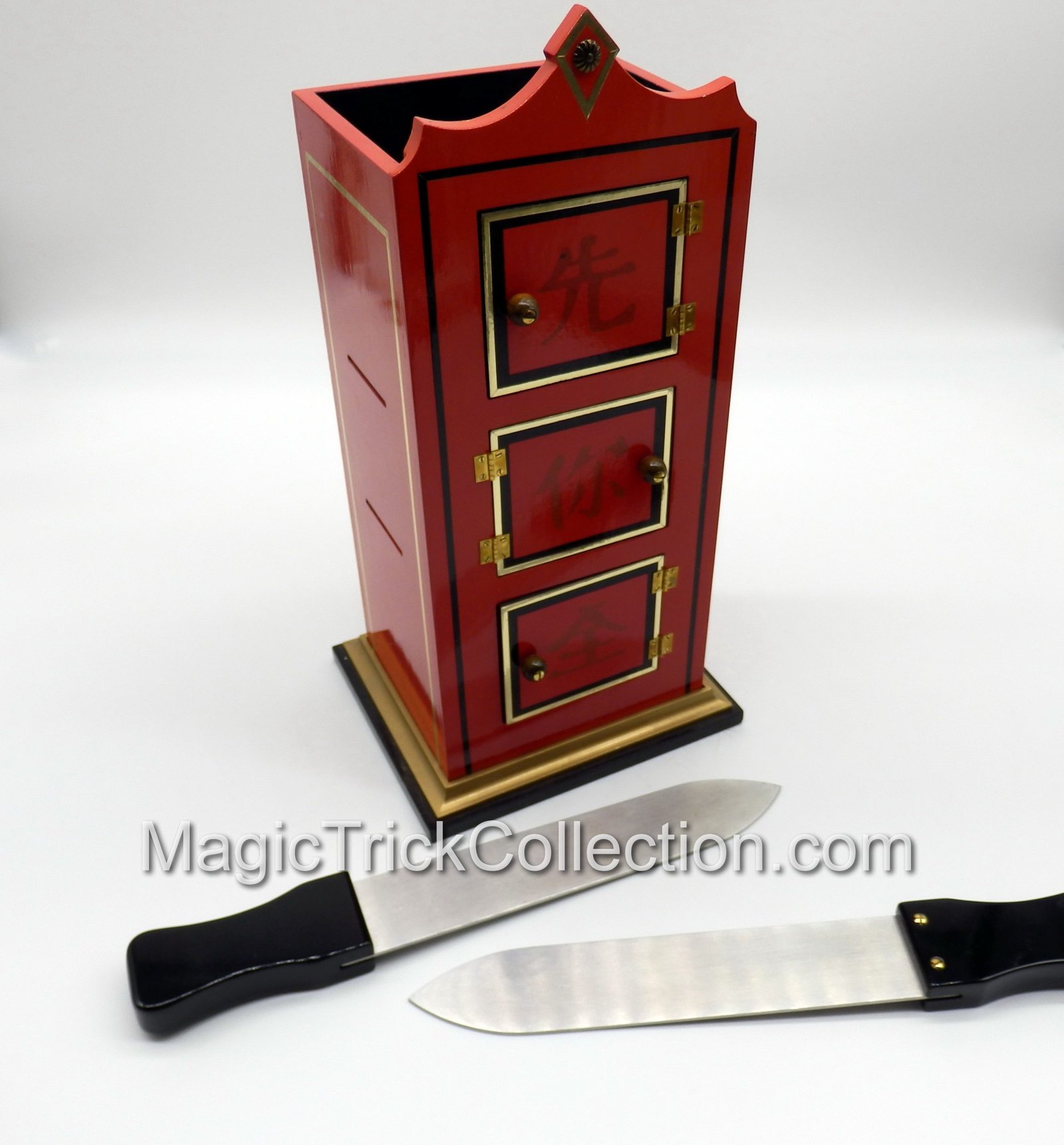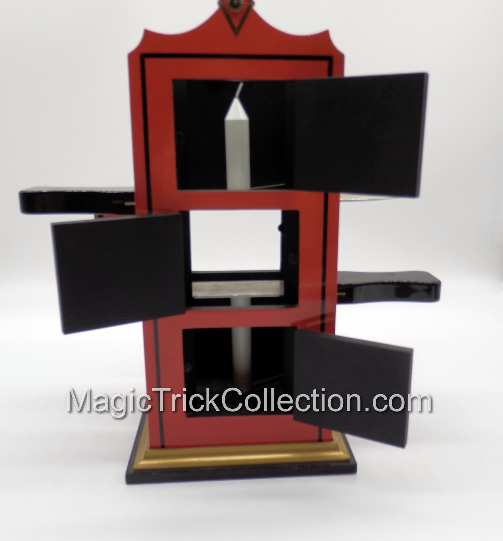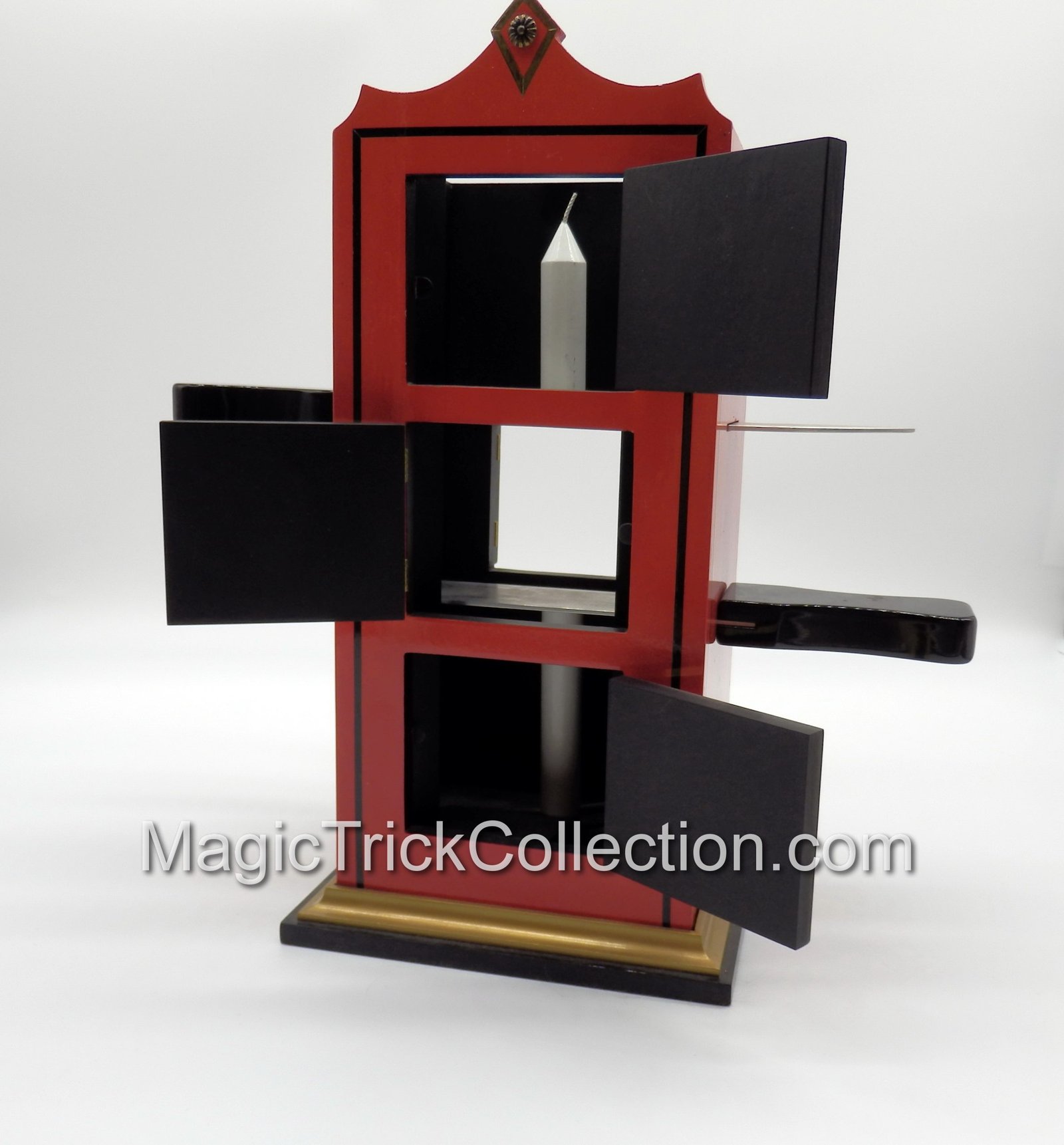 Effect:  A white candle is passed to the audience for examination, then placed in an elaborately decorated Chinese tower. Three doors in front and one in the rear of the tower are opened to show the candle in position. The doors are closed, two metal blade daggers inserted, and the doors reopened to show that the middle portion of the candle has vanished. A silk may be drawn through the two center doors to prove the absence of mirrors or other devices. The doors are again closed and the whole candle is restored.