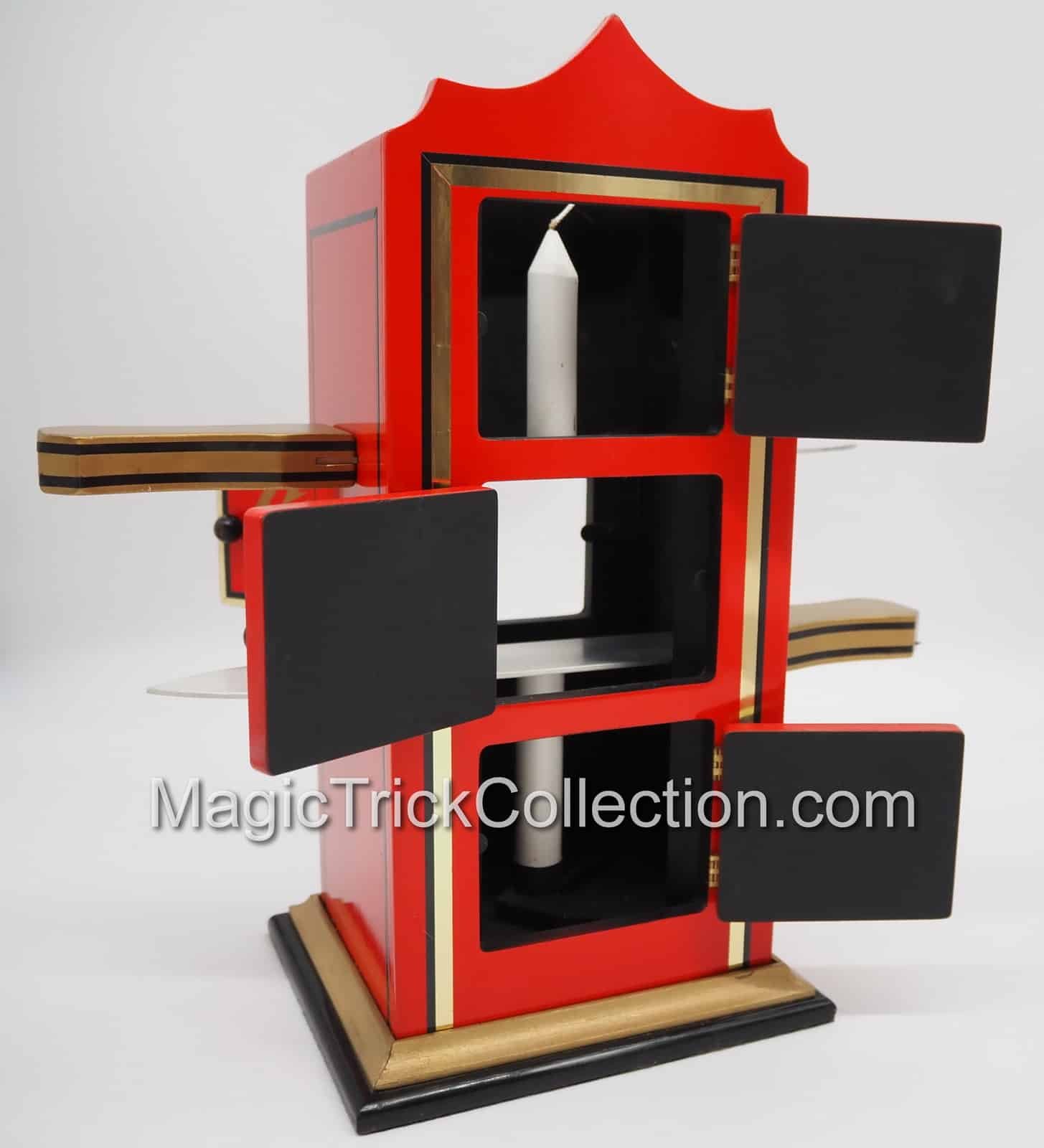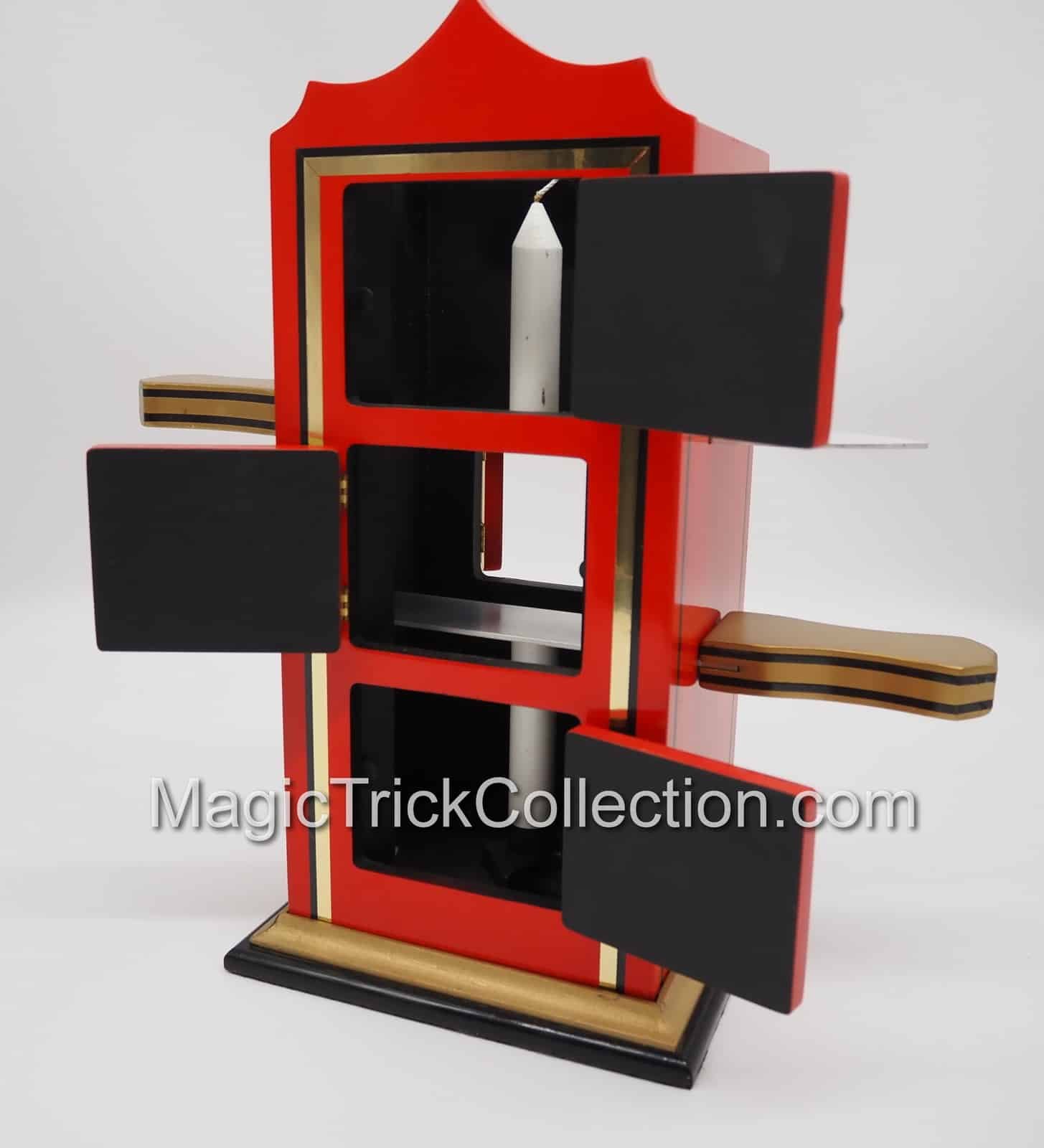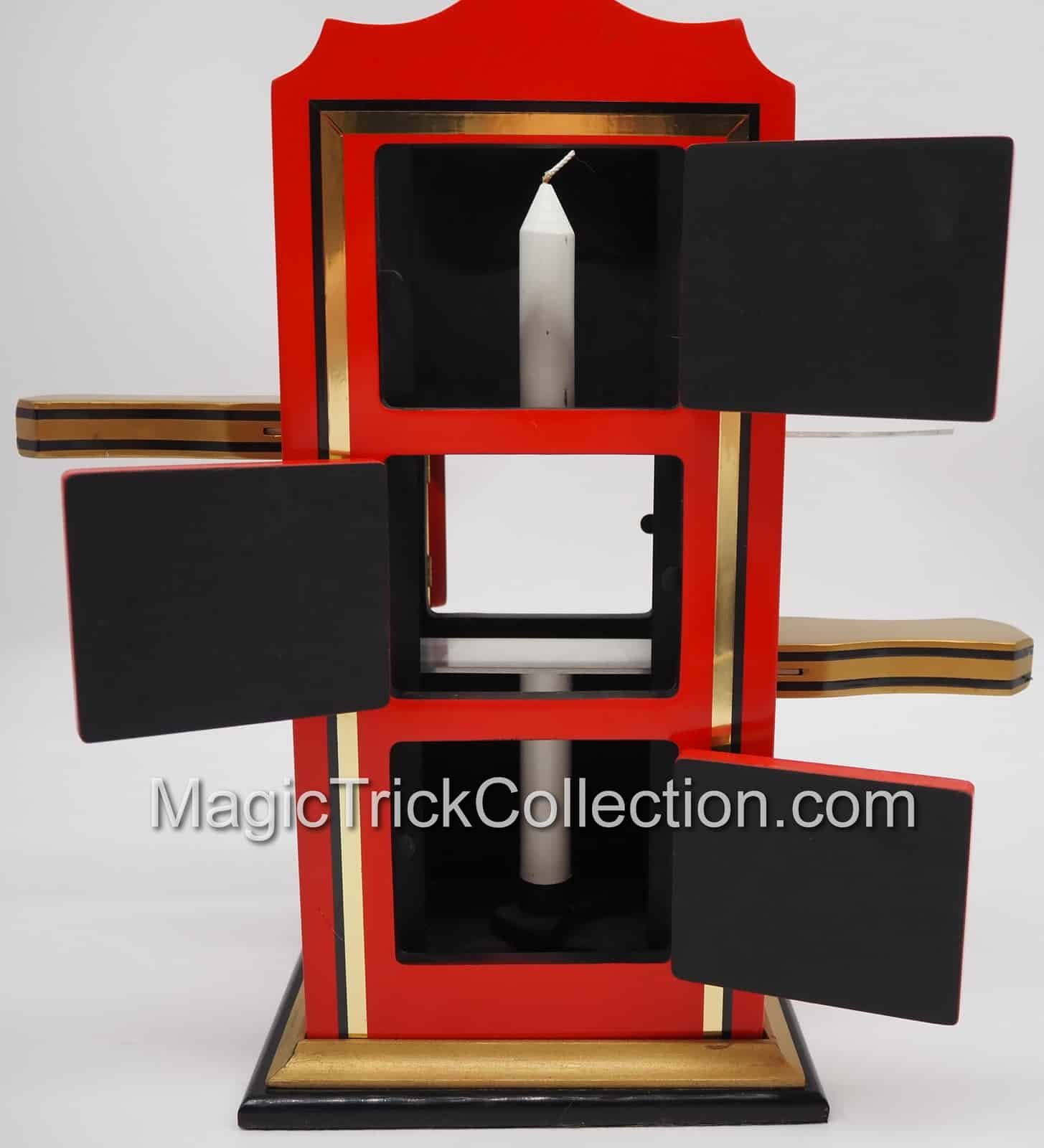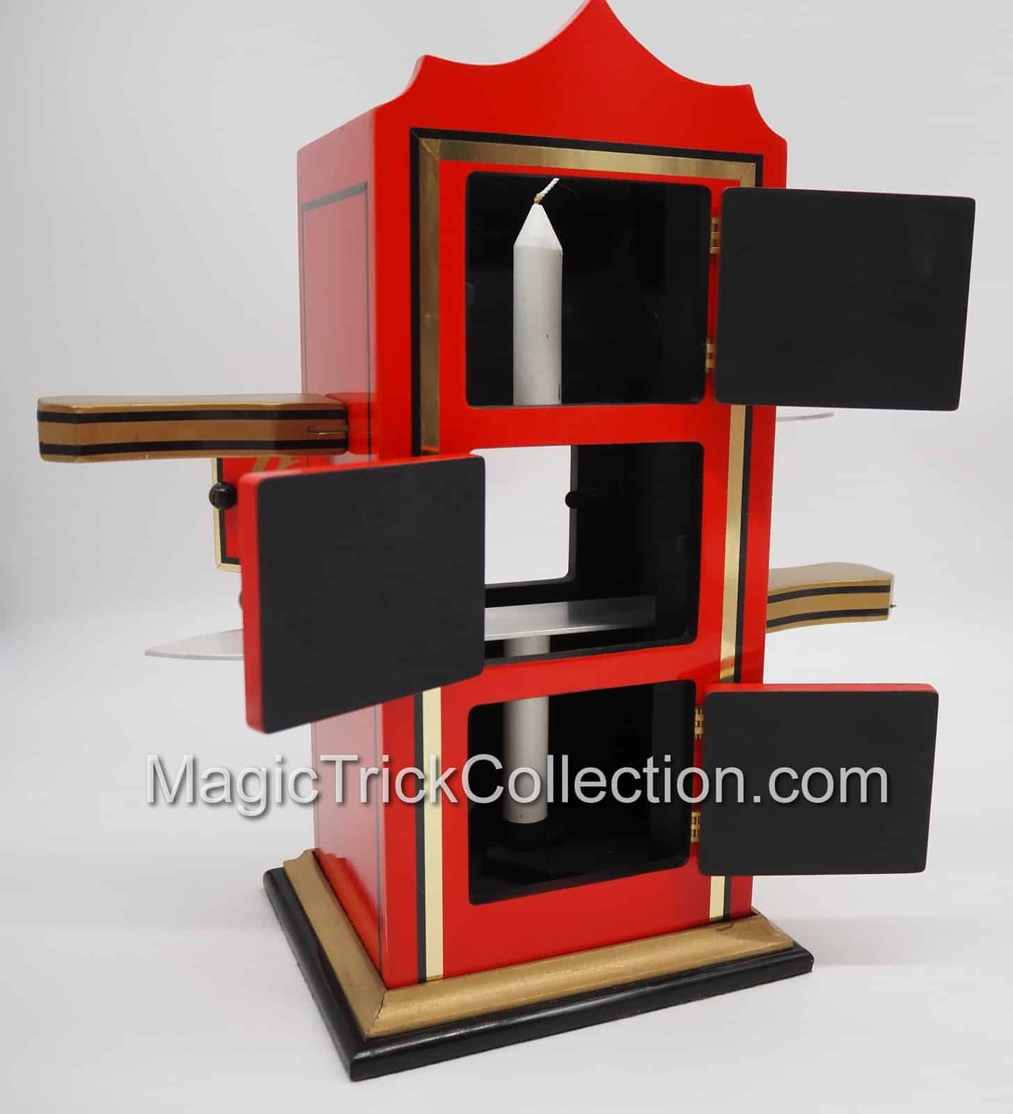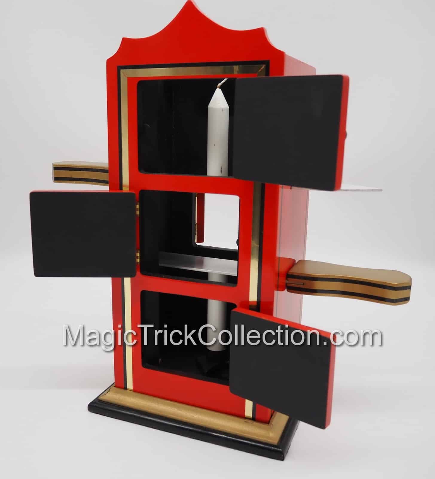 Classic effect where a candle is placed into the oriental themed cabinet, knives insert to seeminly cut the candle into three pieces. Upon opening the front doors the magician has made the entire center section of the magically candle disappear as proved by opening the rear center door where spectators can clearly see all the way throughthe center section.
