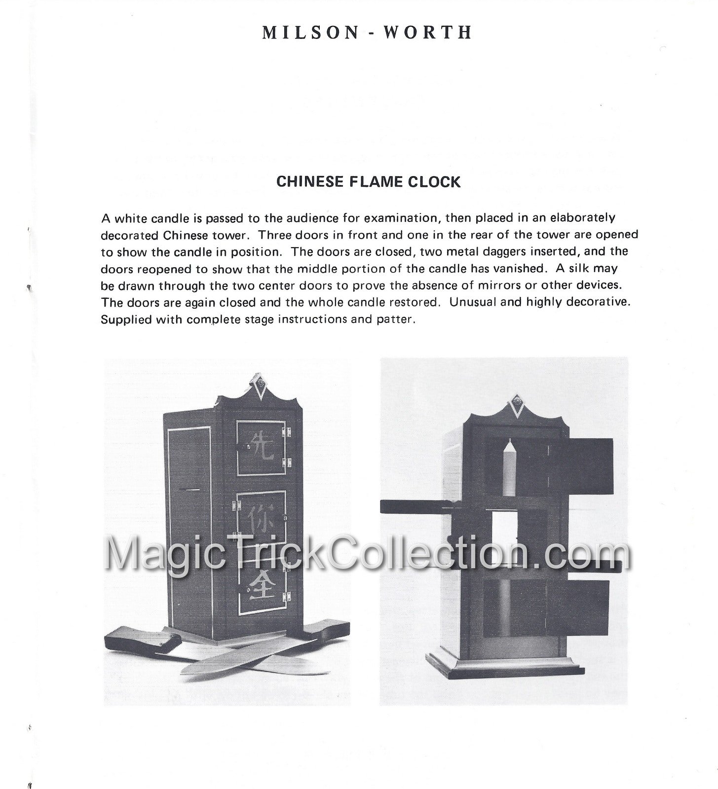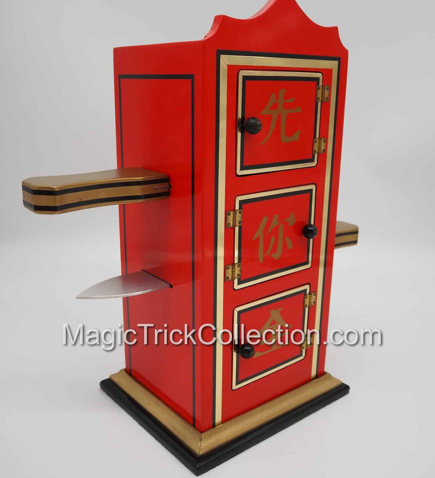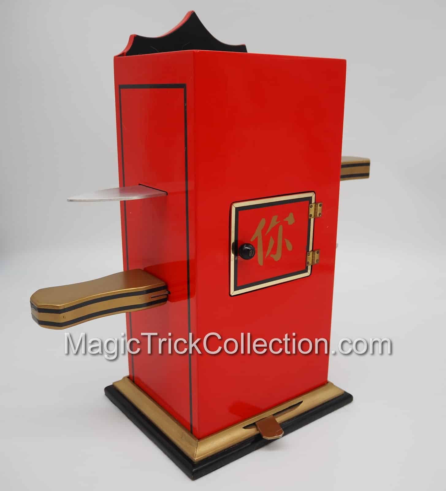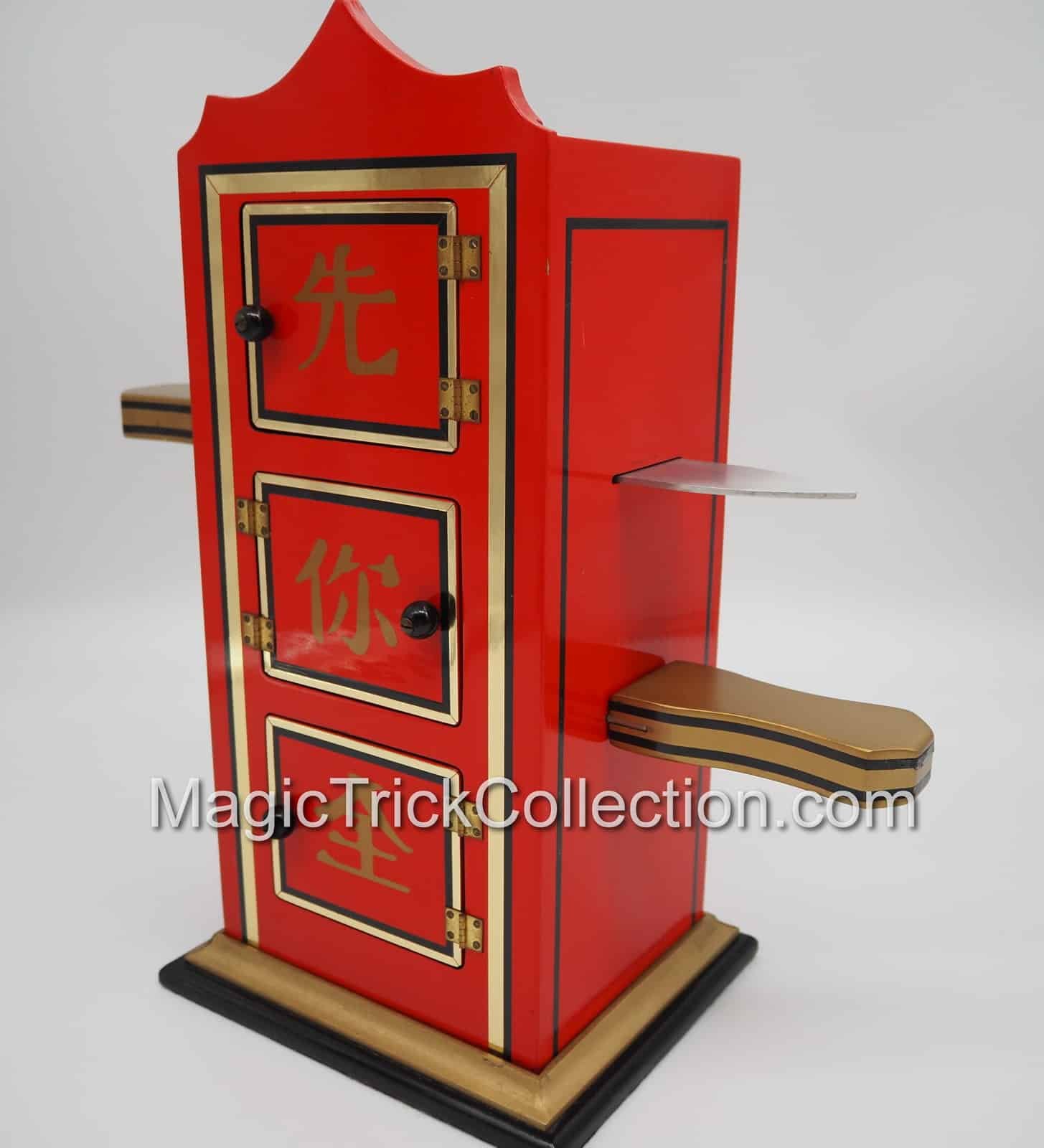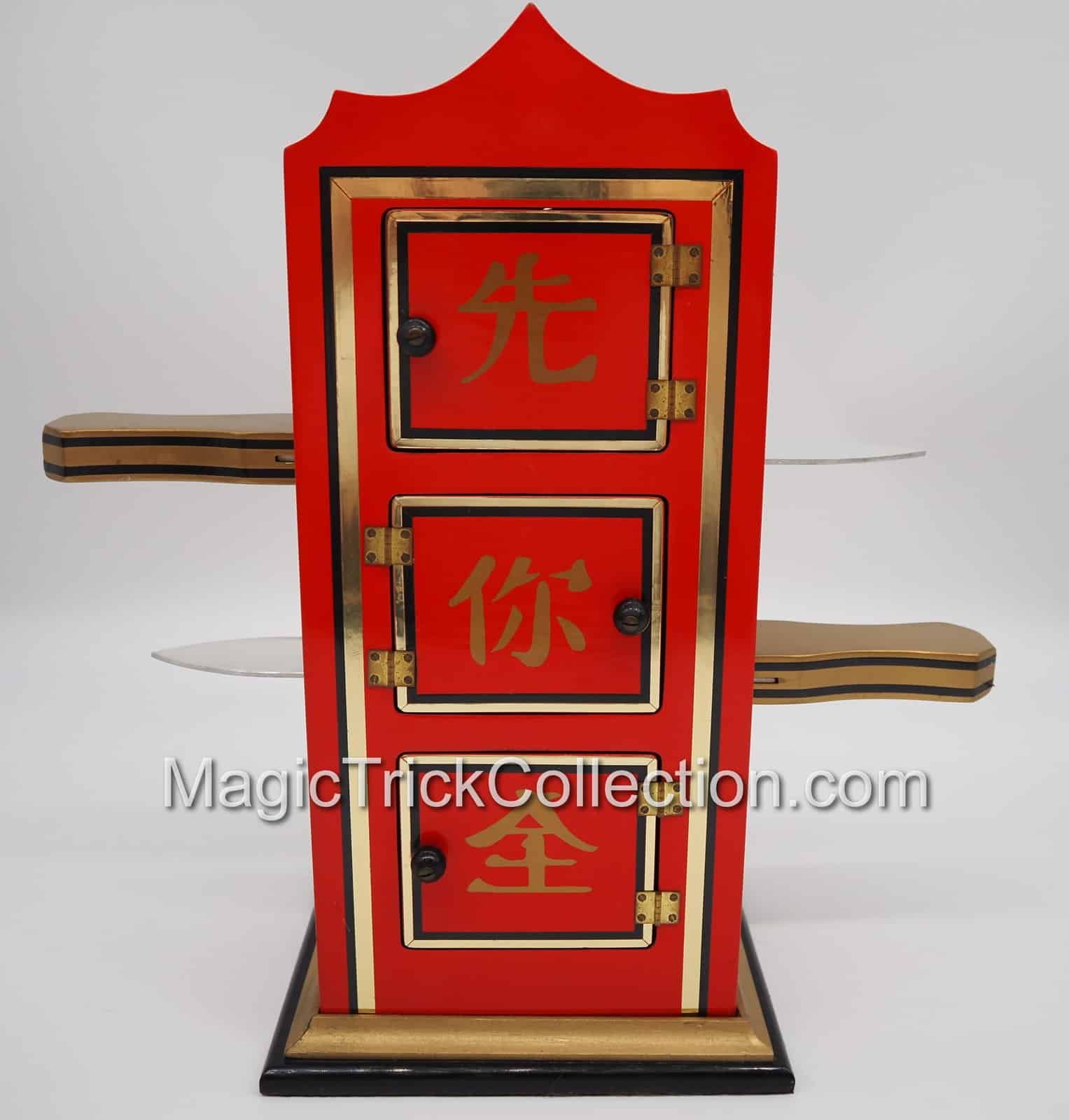 Classic effect where a candle is placed into the oriental themed cabinet, knives insert to seeminly cut the candle into three pieces. Upon opening the front doors the magician has made the entire center section of the magically candle disappear as proved by opening the rear center door where spectators can clearly see all the way throughthe center section.