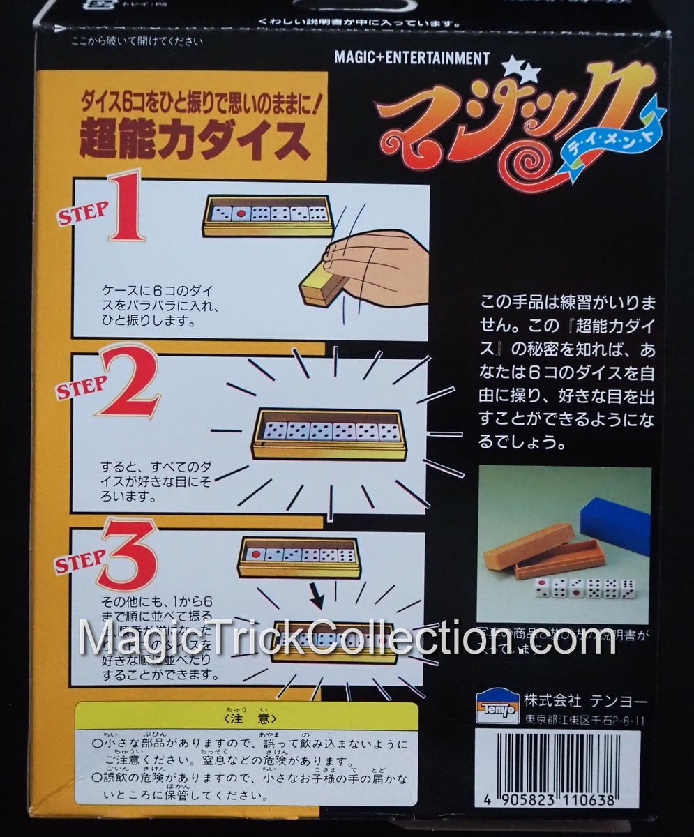 Tenyo Magic Flash Dice T-72 Six dice placed into a small case at random covered with a lid and shaken, lid is removed, dice are lined up in order from 1 to 6.