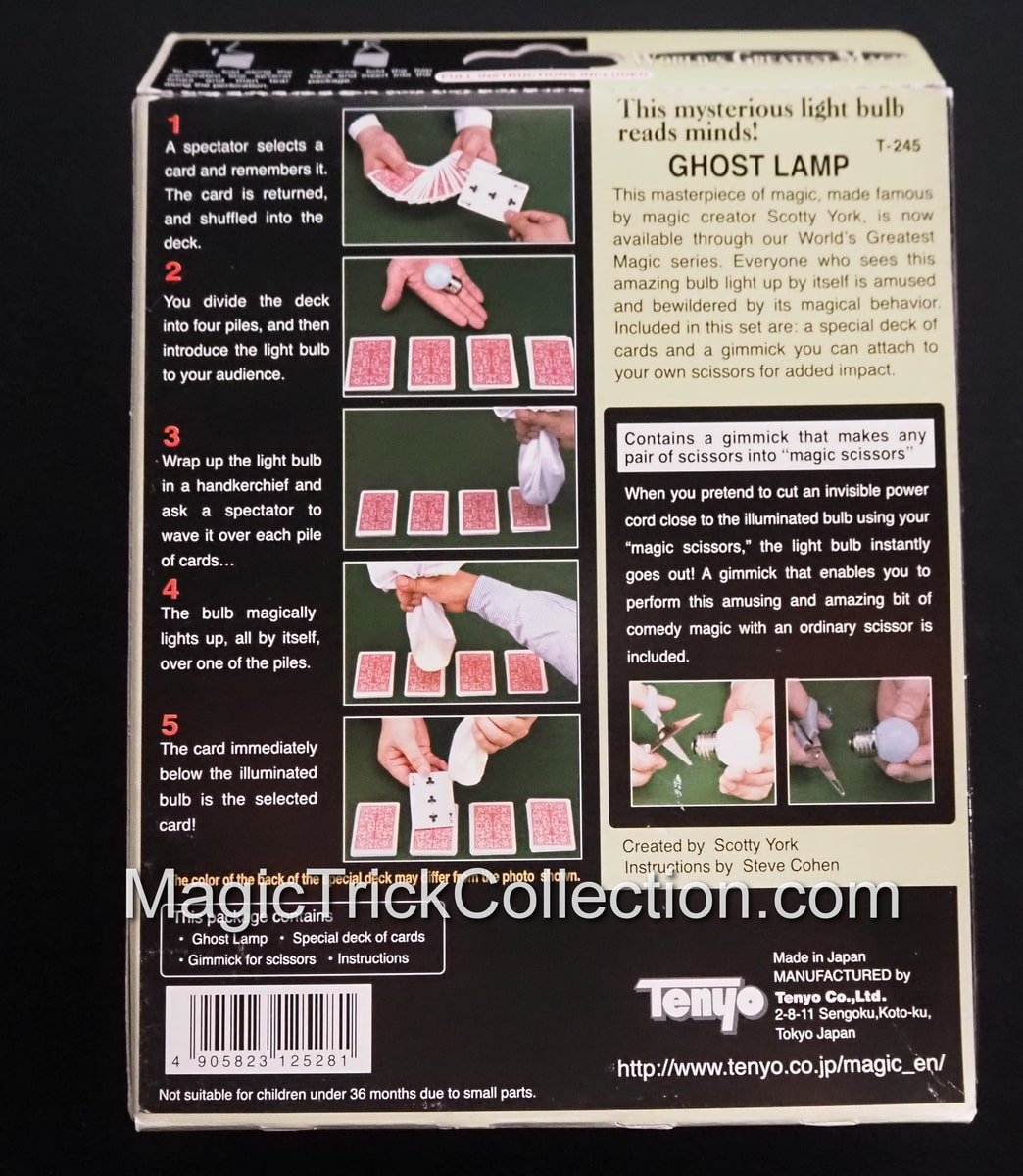 Wrap a light bulb (Ghost Lamp) inside of a handkerchief, and allow a spectator to wave it over several piles of cards. When the Ghost Lamp bulb comes close to one pile, it lights up! Sure enough, the top card of that pile is the spectator’s selected card. To turn the light bulb off, you cut an “invisible” wire with a scissor. At the instant you snip the invisible wire, the bulb goes out! This masterpiece of magic, made famous by magic creator Scotty York, is now available through our World’s Greatest Magic series. Included in this set are: a light bulb, a trick deck of cards and a special gimmick you can use for added impact.