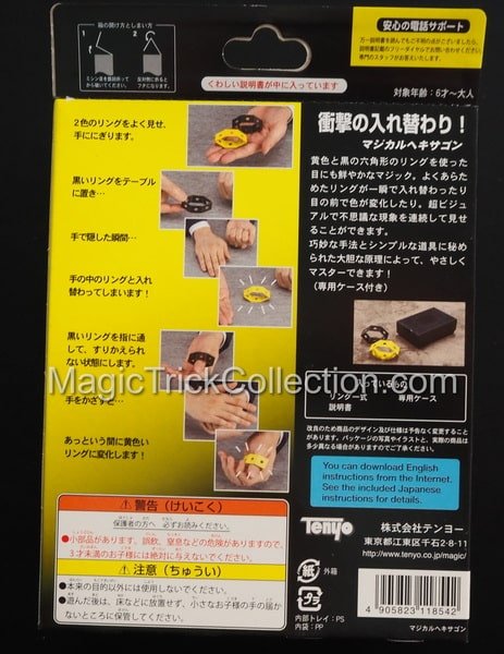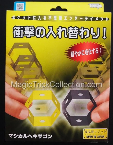Tenyo Magic Magical Hexagon, this snappy trick uses two hexagonal rings, one yellow and one black. Each ring is punched with a series of holes. After showing the front and back of each ring, they instantly change places and change color in increasingly visual and surprising ways. You will be able to master this Tenyo Magic Magical Hexagon trick in no time flat, thanks to the clever method and bold principle built into the simple props.