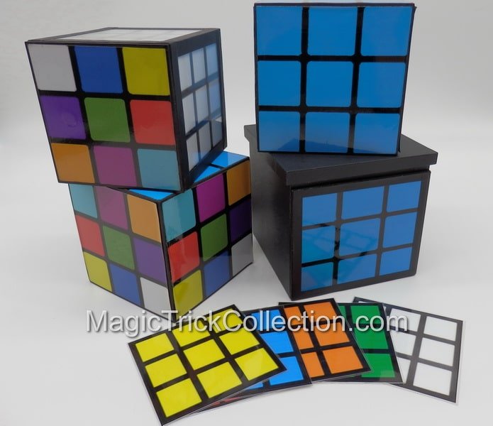 Performer displays a clear die, then draws a rubik outline on a dry erase side on a box. Then magically the clear die changes to a white rubik, exactly what the magician has drawn. Then upon drawing in a colors on the dry erase sections, upon placing the white die in to the box it magically changes to the exact rubik cube.