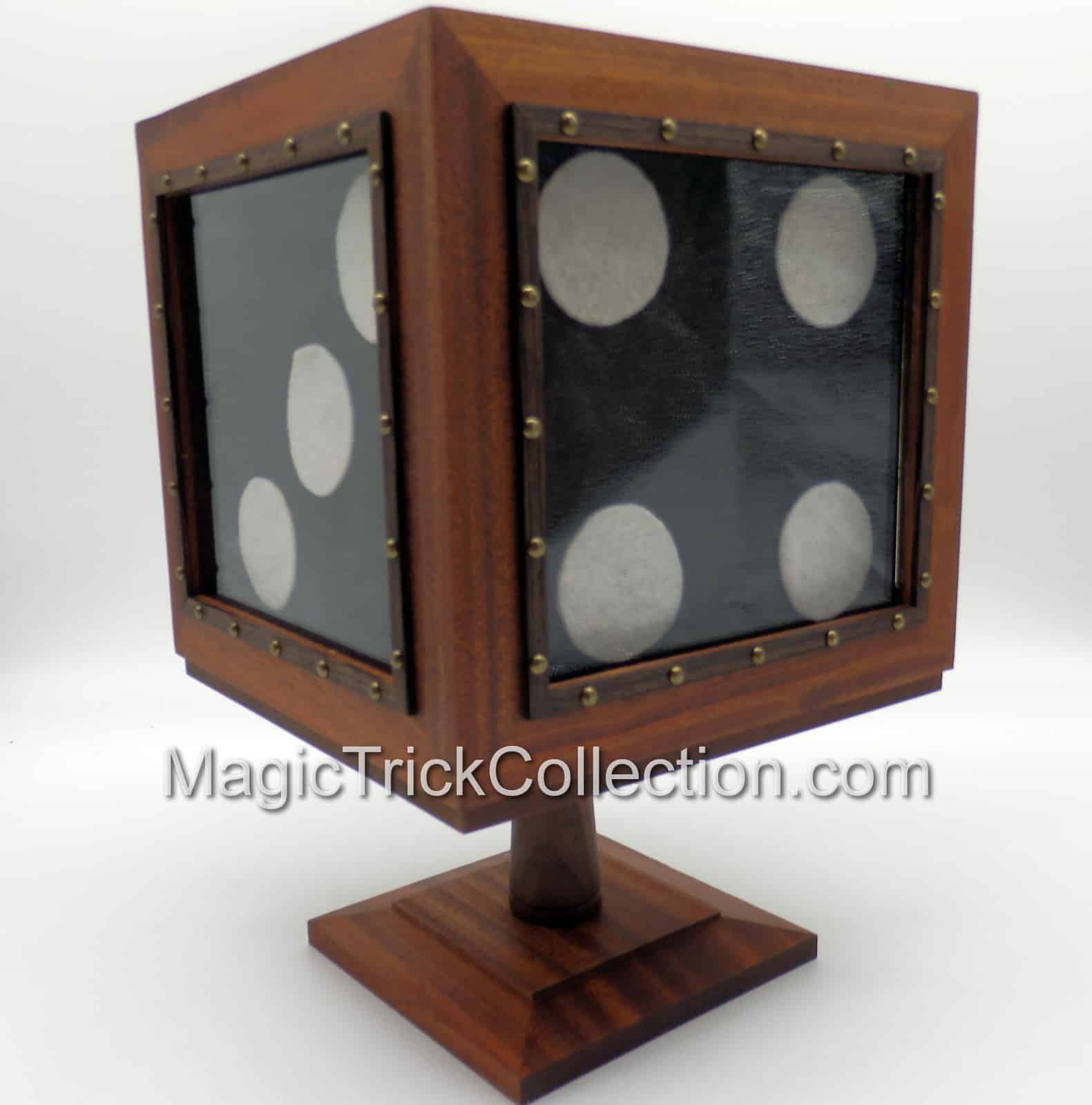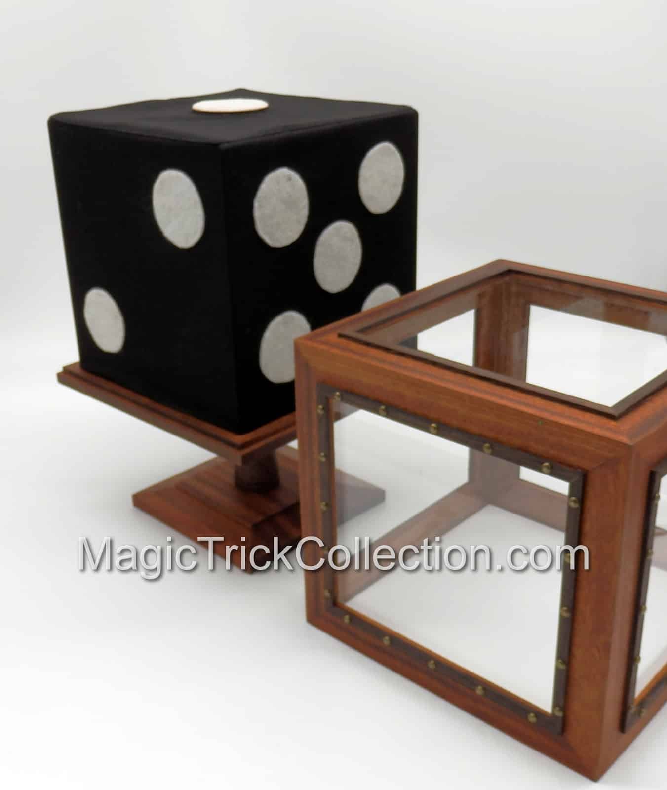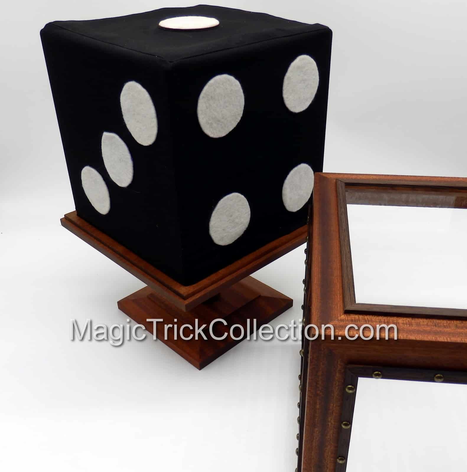 DESCRIPTION: The effect of the Tora Magic Wooden Disappearing Dice, the performer picks a big black die (9 x 9-inches) up from its base and turns it around showing all its sides. A wood box with clear plastic windows is placed over the jumbo black die. The