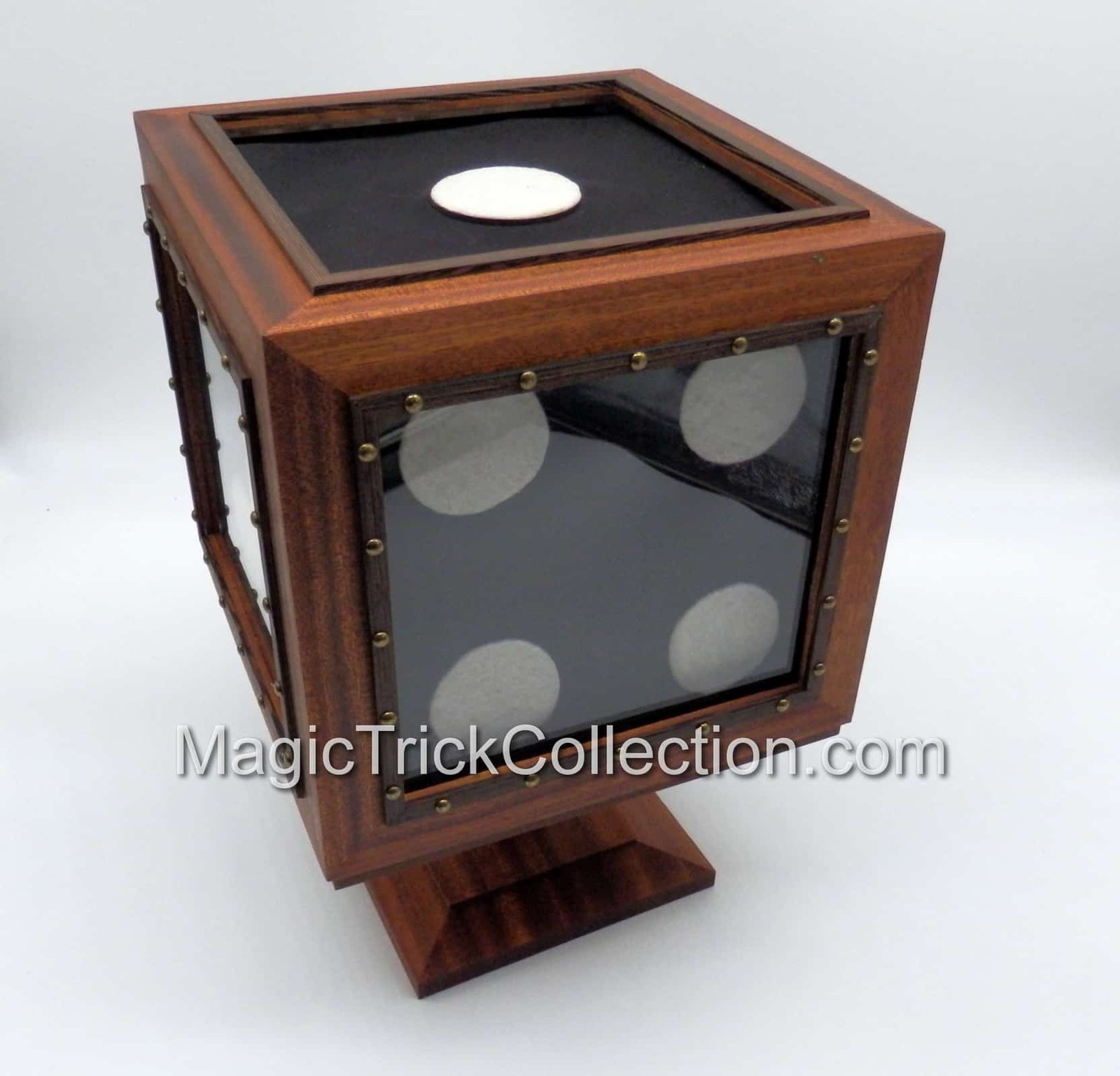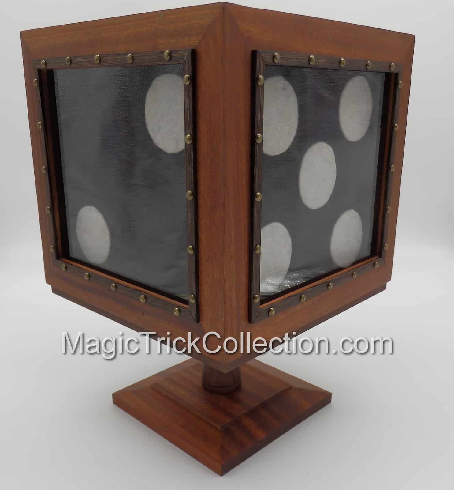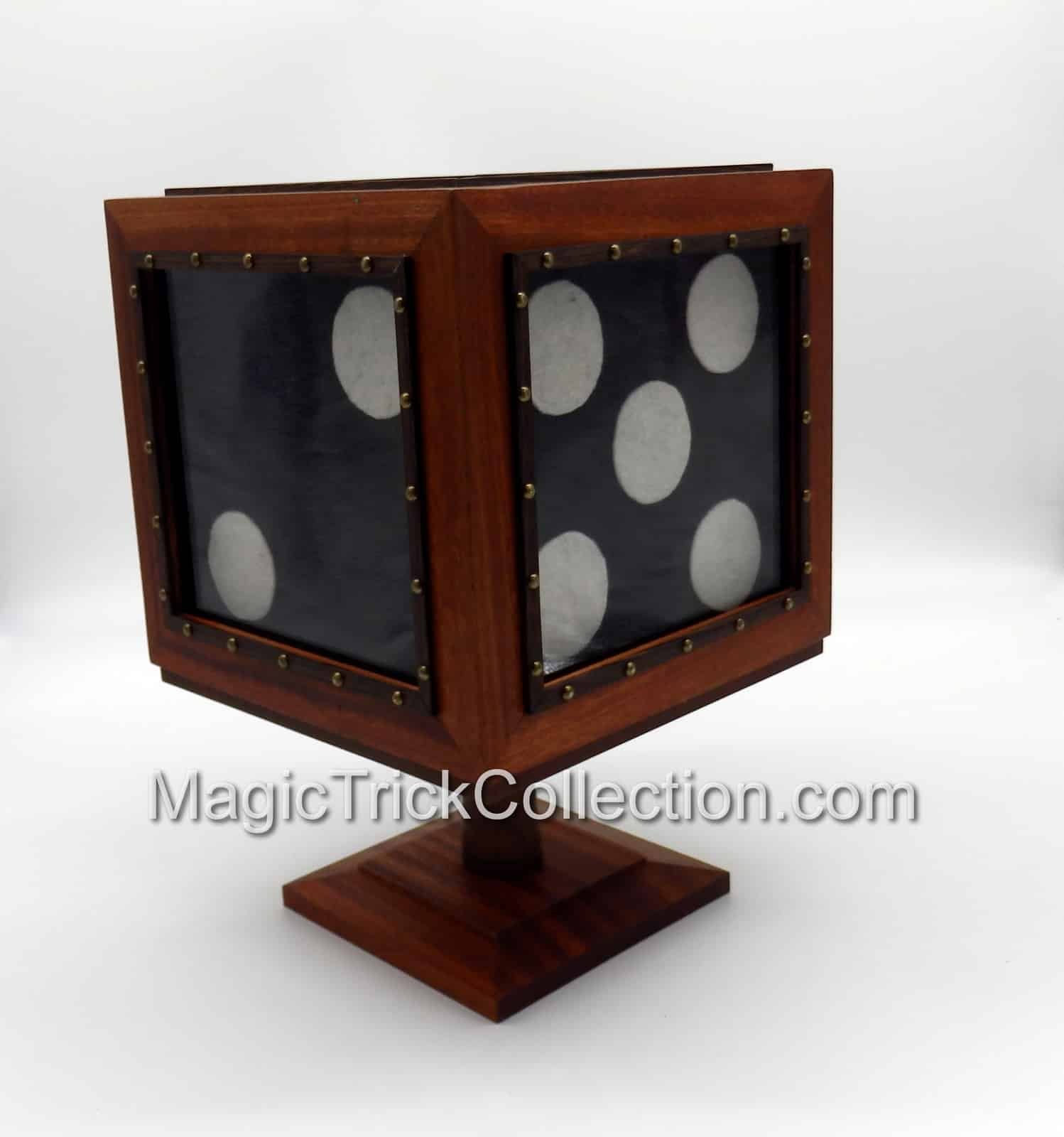 DESCRIPTION: The effect of the Tora Magic Wooden Disappearing Dice, the performer picks a big black die (9 x 9-inches) up from its base and turns it around showing all its sides. A wood box with clear plastic windows is placed over the jumbo black die. The