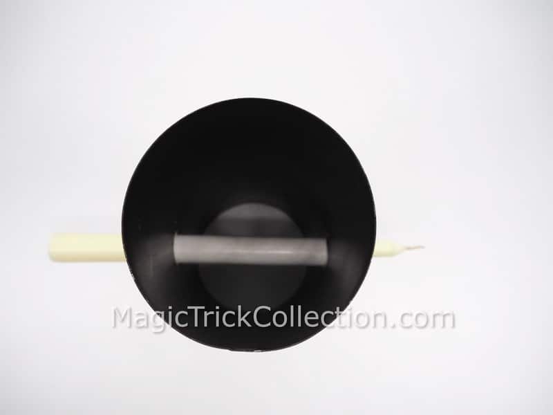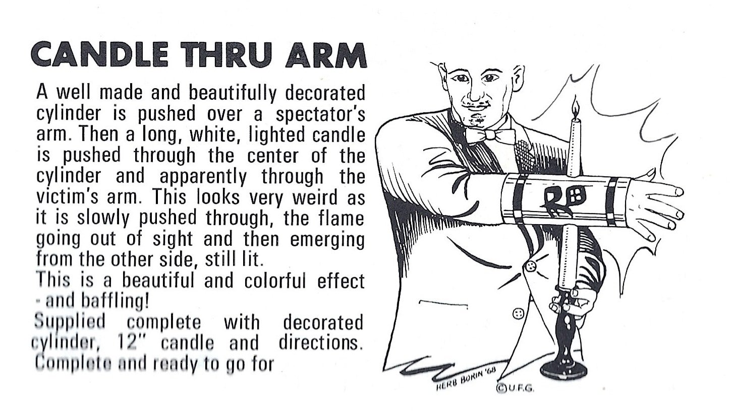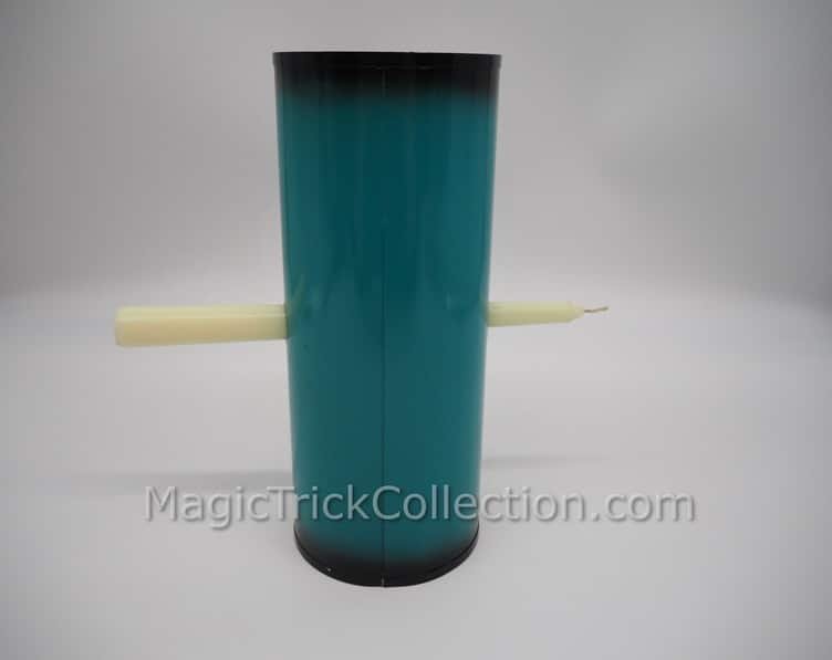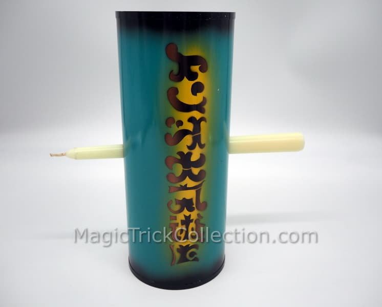 A decorated cylinder is placed over the magician’s or spectator’s arm. Then a long white candle is pushed through the center of the cylinder apparently penetrating the arm completely.